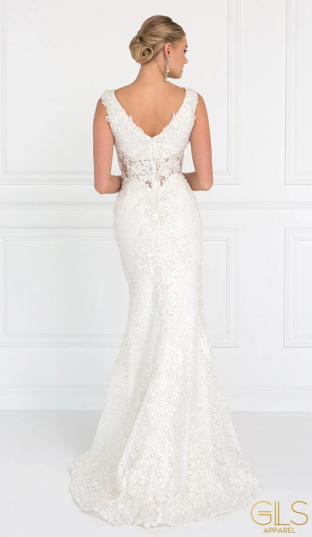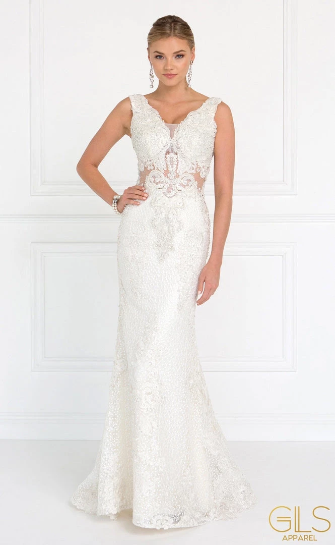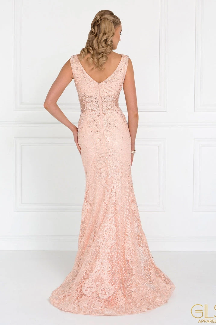 Captivate the room in this long peach lace mermaid dress with sheer cutouts by Elizabeth K GL1533. Sleeveless full lace dress with deep V-neckline with a mermaid silhouette. Sheer panel side and center cutouts with bold jewel and beading detail through out on a solid one tone. Perfect for any formal event!