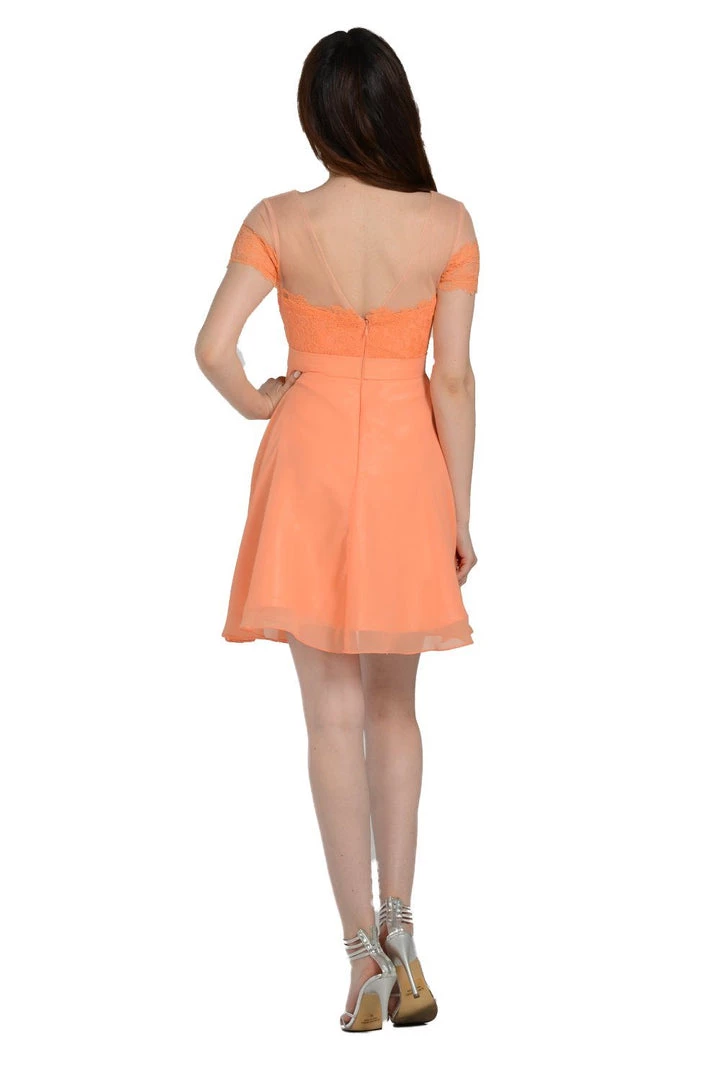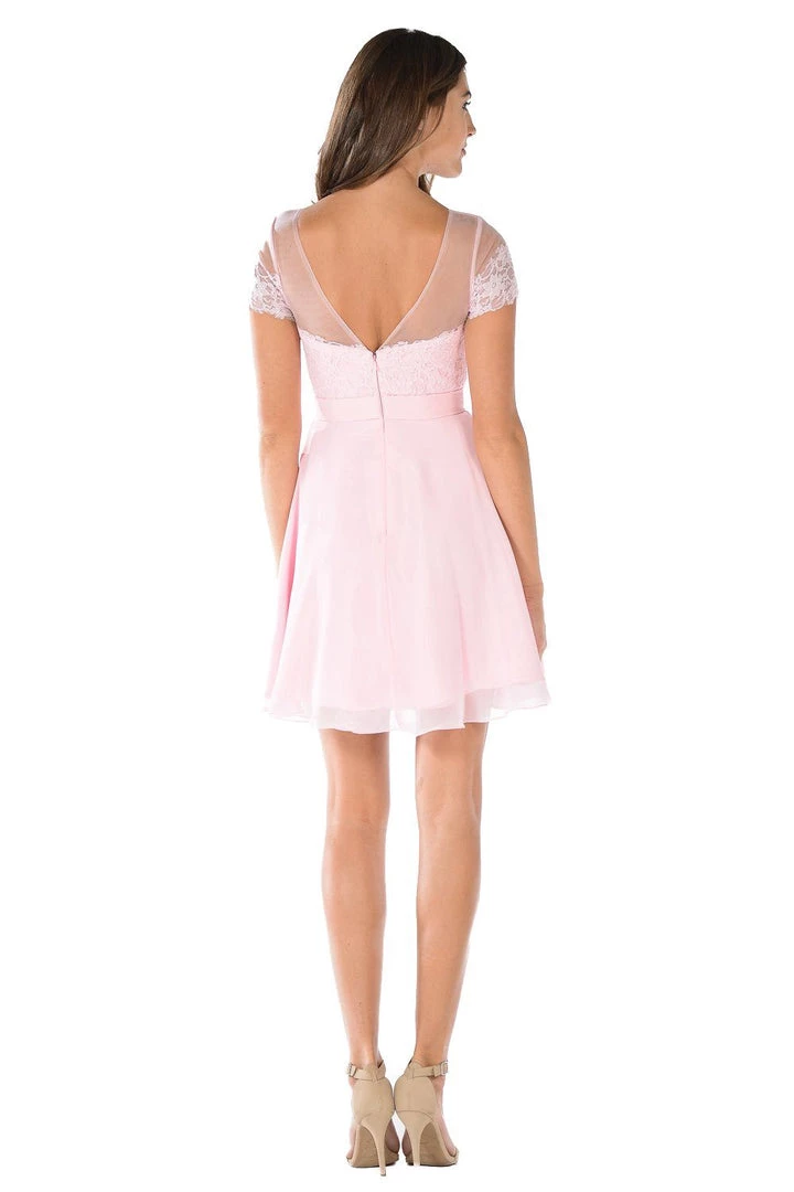 Receive lots of compliments in this short pink dress with illusion lace short-sleeved bodice by Poly USA Style Number 7518. This cocktail dress features a short-sleeved illusion bodice embellished with lace appliques. A flirty sheer open V-shaped back, a short A-line skirt, and a zipper closure complete this beautiful look. Affordably priced under $150, this dress is perfect for any formal event and will keep you on budget!