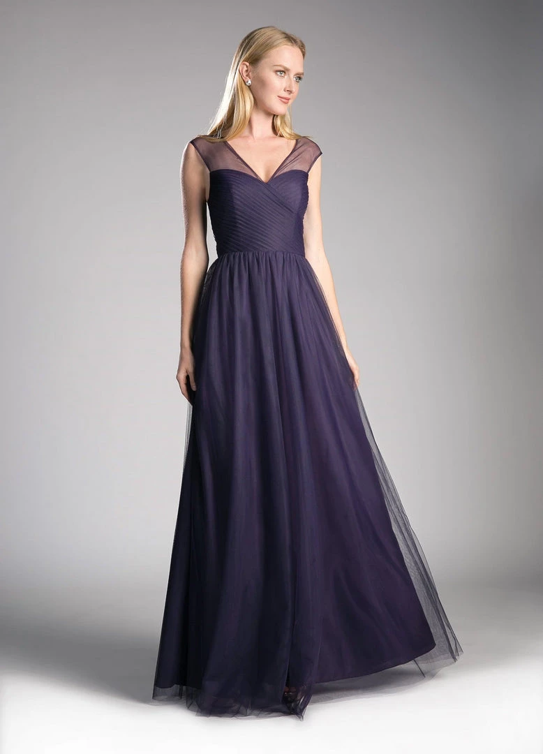 Create lasting memories in this long pleated formal dress with illusion straps by Cinderella Divine ET320. This evening gown features a beautiful V-neck pleated sleeveless bodice, sheer straps, a V-shaped open back, a floor length A-line tulle skirt, and a zipper closure. Affordably priced under $140, this dress is perfect for any formal event and will keep you on budget!