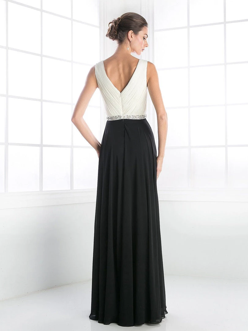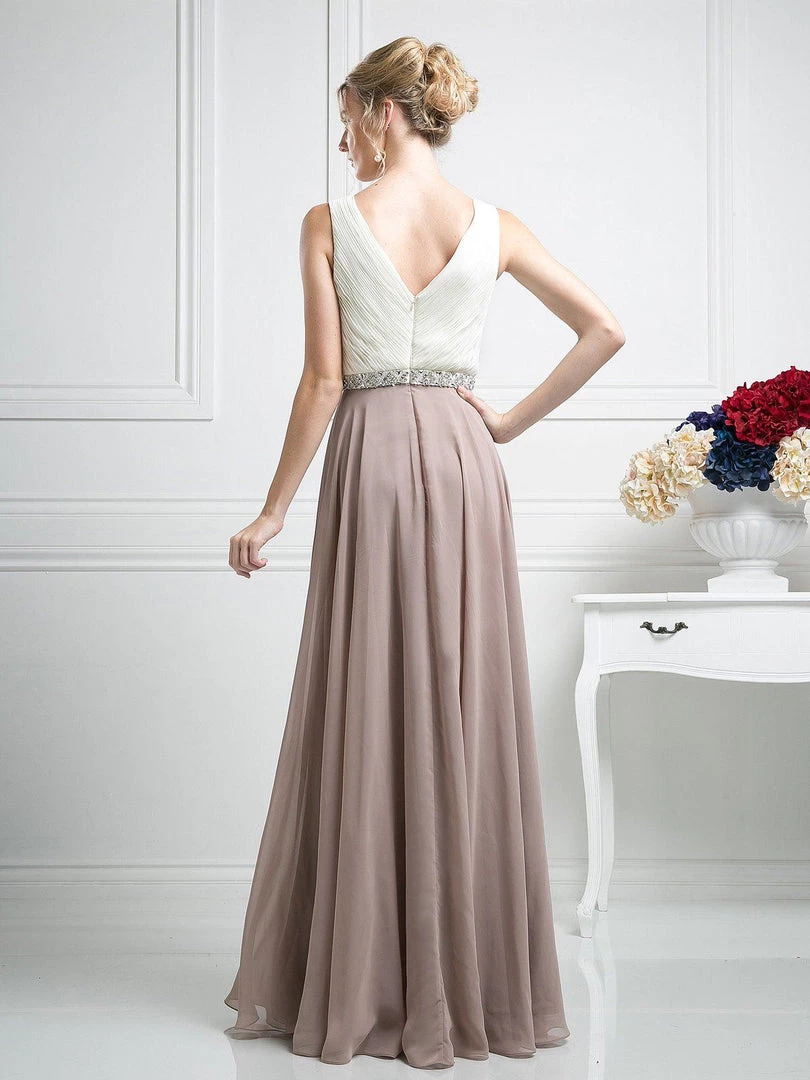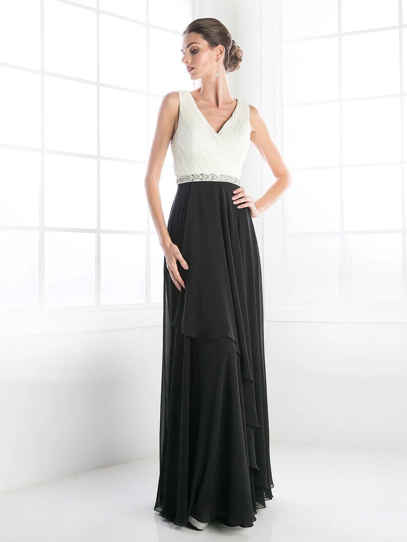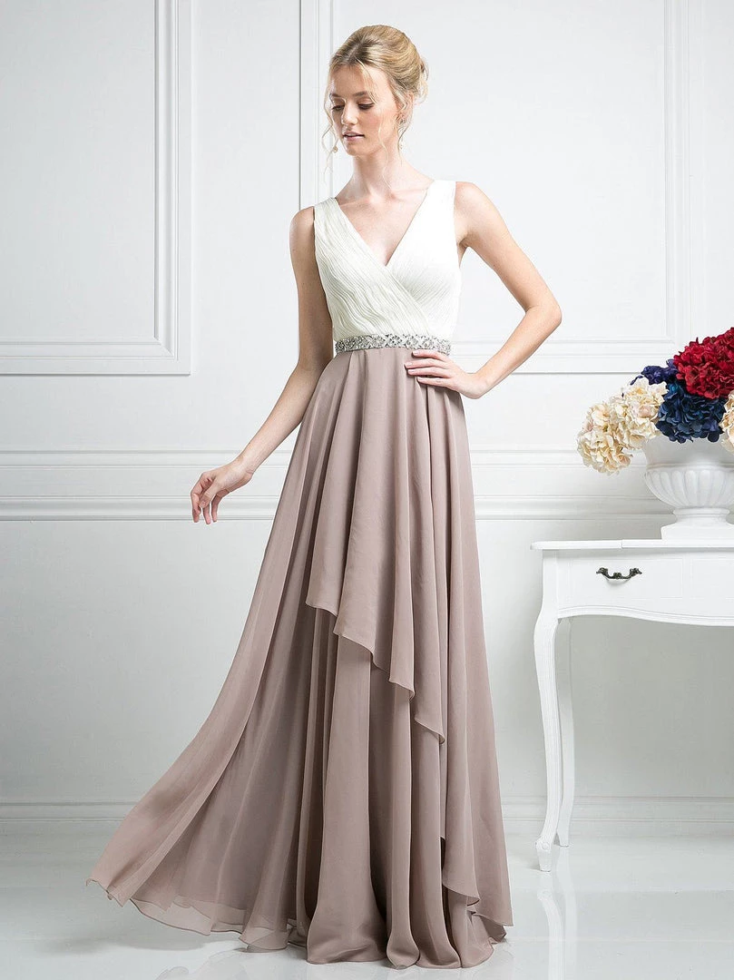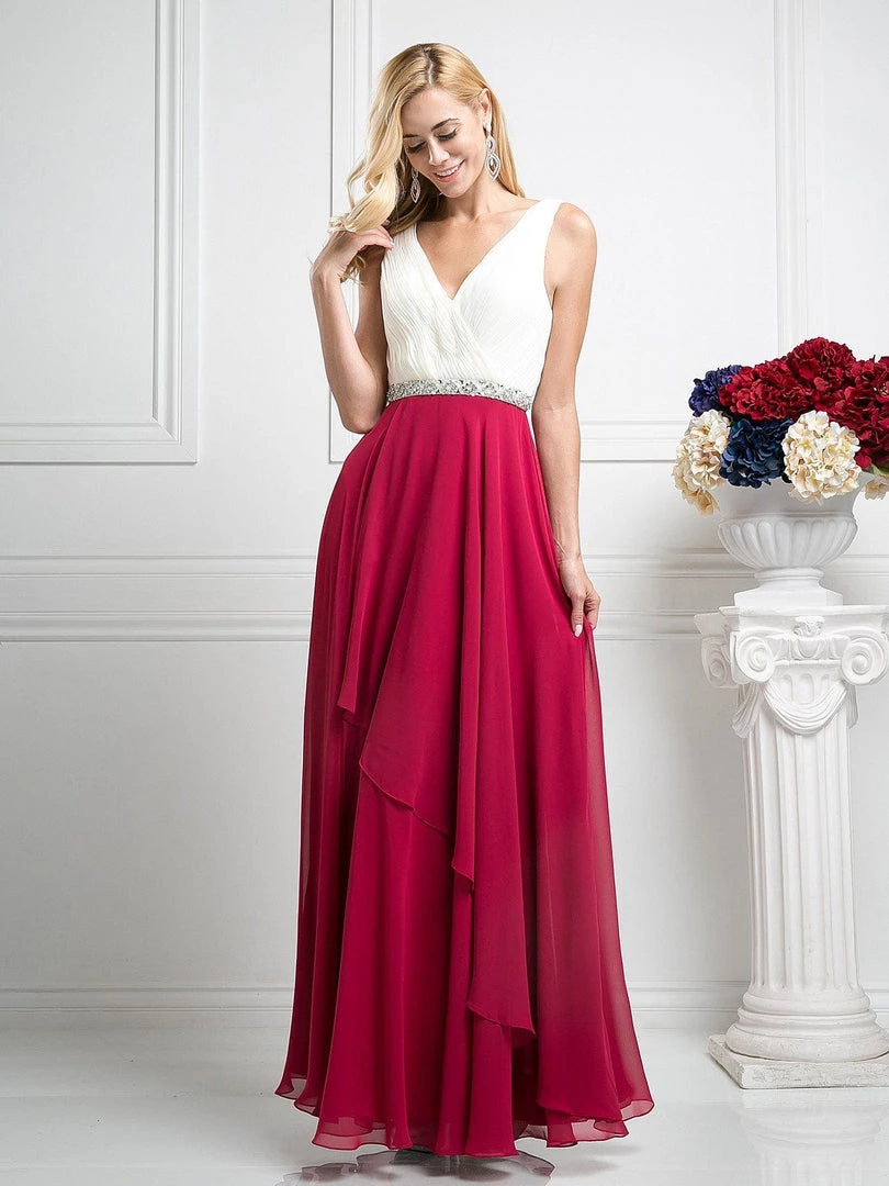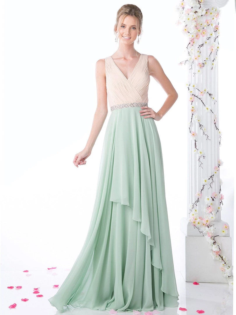 You’ll be the life of the party in this pleated long V-neck chiffon dress by Cinderella Divine 1968. This classic and elegant dress features a pleated V-neck bodice with sparkling jeweled details on the natural waist. Full long flowy layered A-line skirt adds movement to the style.