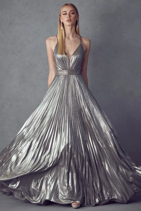 Be red carpet ready in this long sleeveless pleated metallic dress by Juliet 226. This dress has a illusion v-neck bodice with straps and zipper closure with a sweep train.