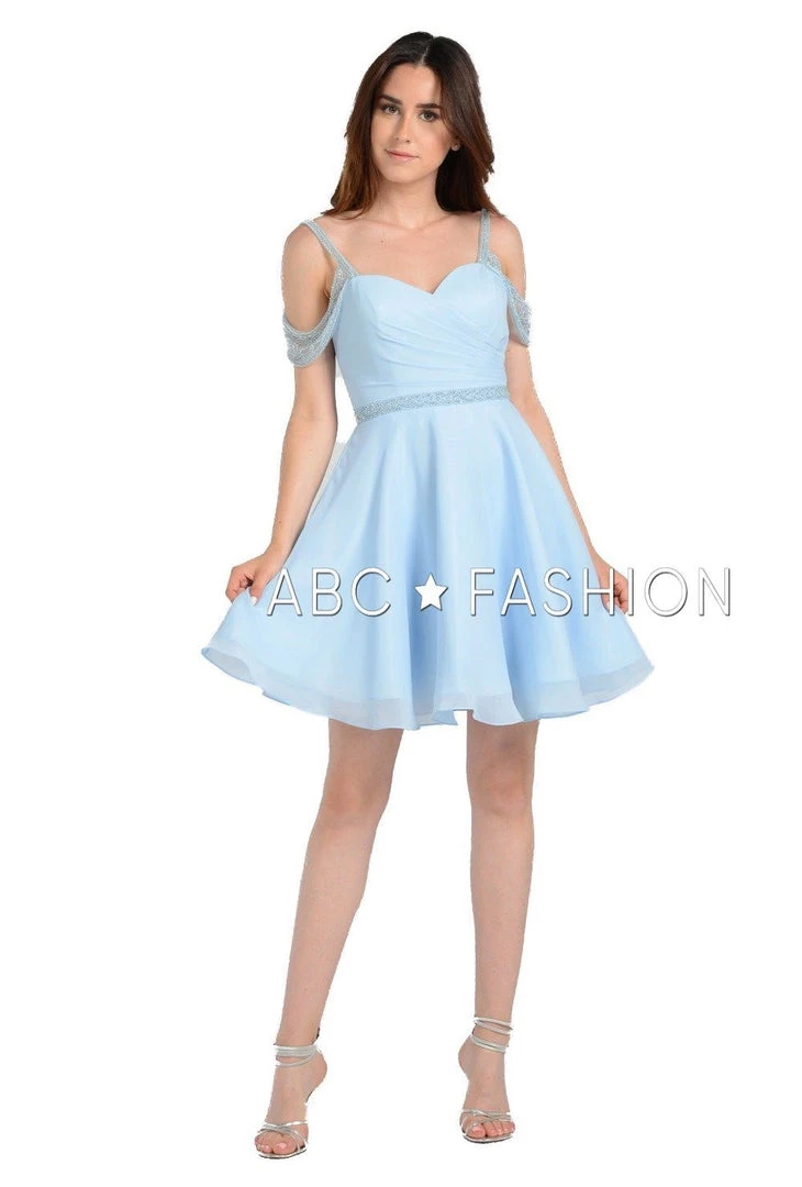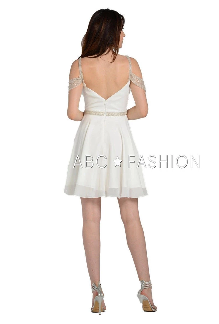 Turn heads in this sweetheart cold shoulder chiffon cocktail dress with beaded waistband by Poly USA 8028. Beautiful chiffon A-line short dress features a pleated sweetheart bodice with chic cold shoulder with beaded sheer sleeves, beaded waistband for a touch of sparkle, flirty open V-back, and zipper closure. Affordably priced at $180, this short party dress is perfect for any semi-formal event and will keep you on budget!