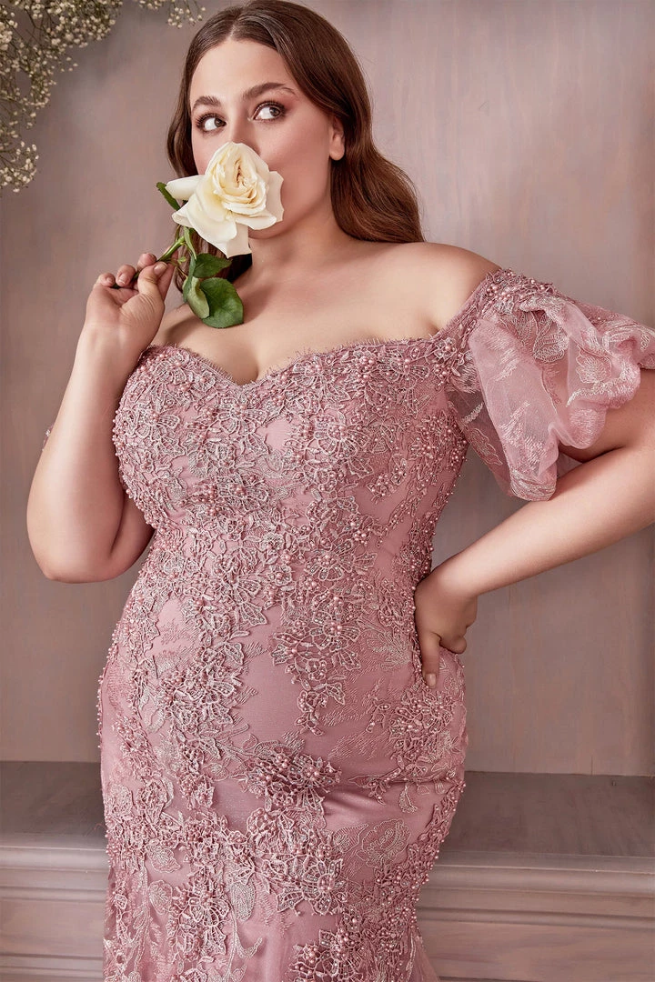 Be the center of attention in this lace applique long off the shoulder plus size mermaid dress by Cinderella Divine CD959C. Bring your romantic visions to life in this fitted mermaid lace gown. This off the shoulder puff sleeve dress is a head-to-toe lace stunner that makes a grand entrance as well as exit with its lace train.