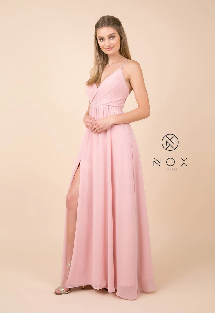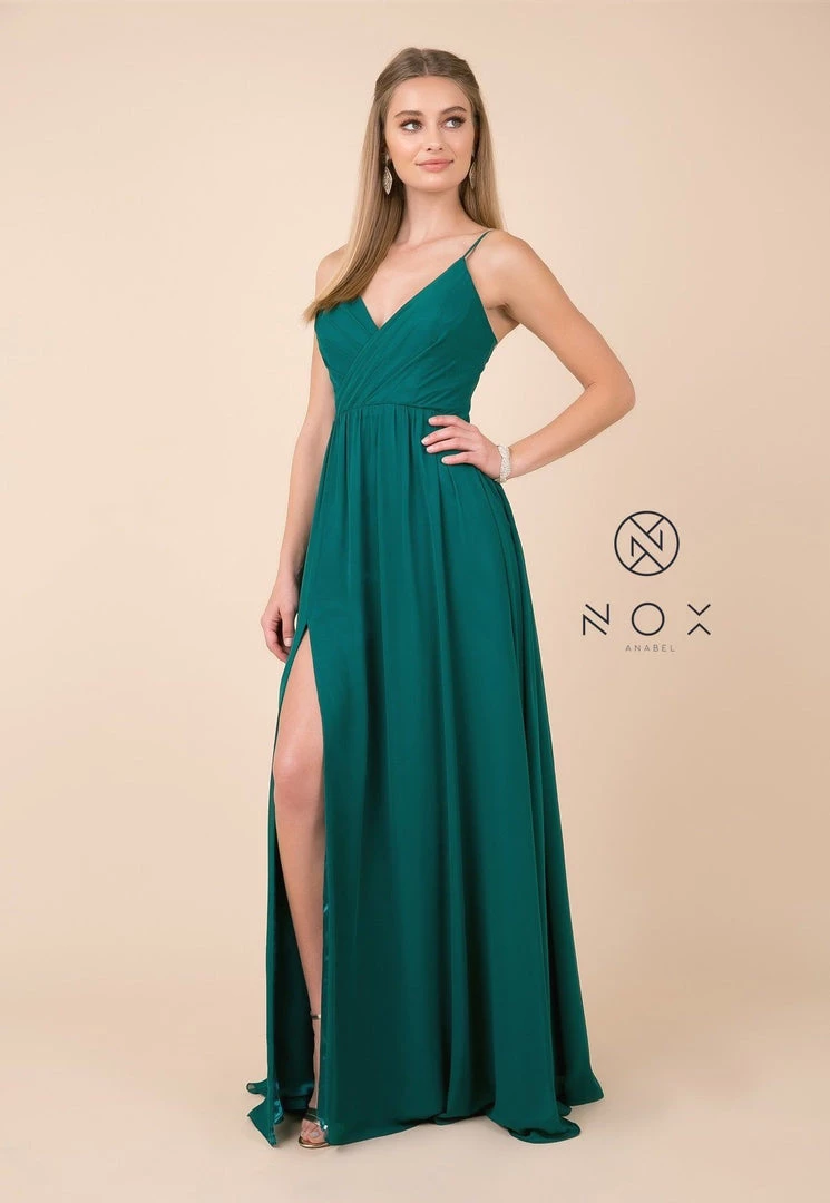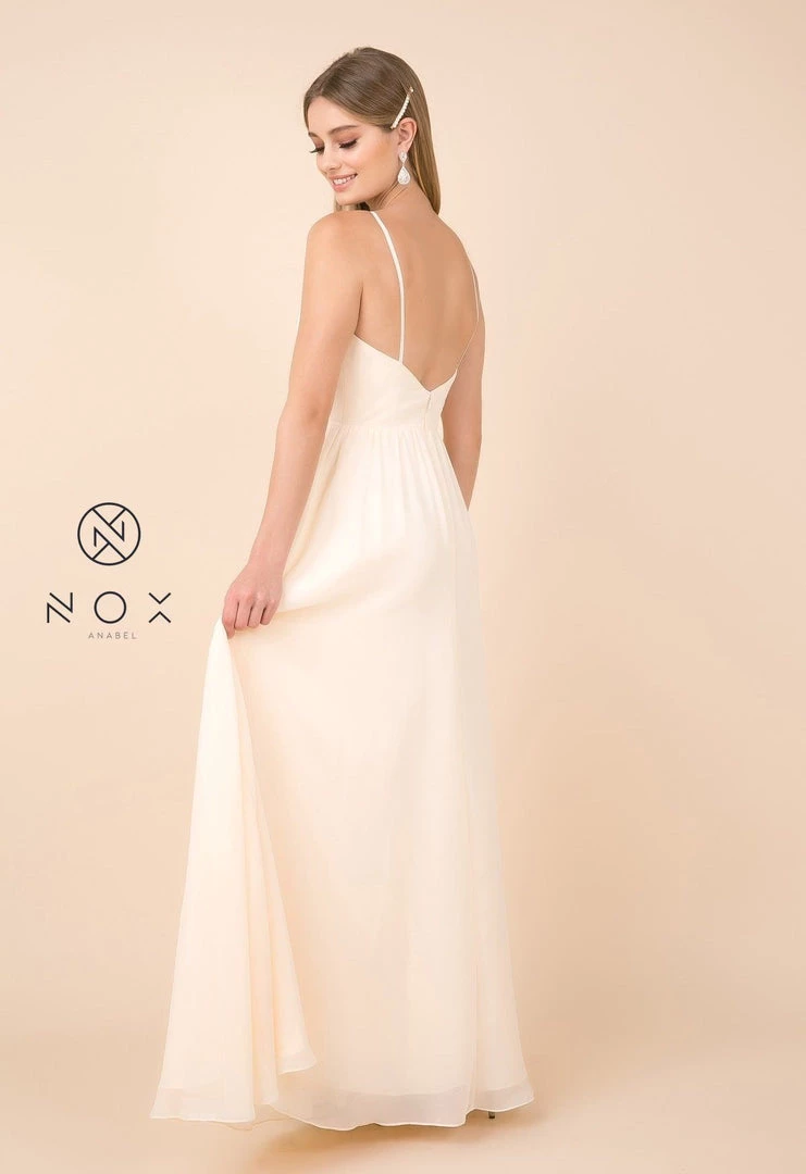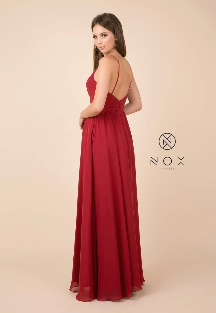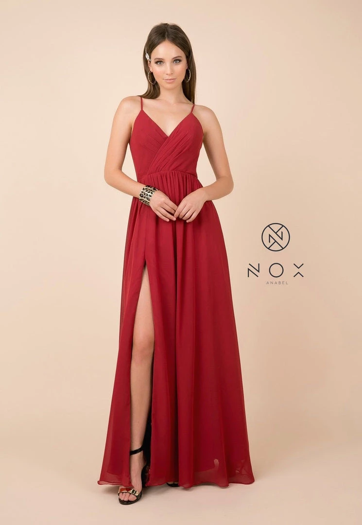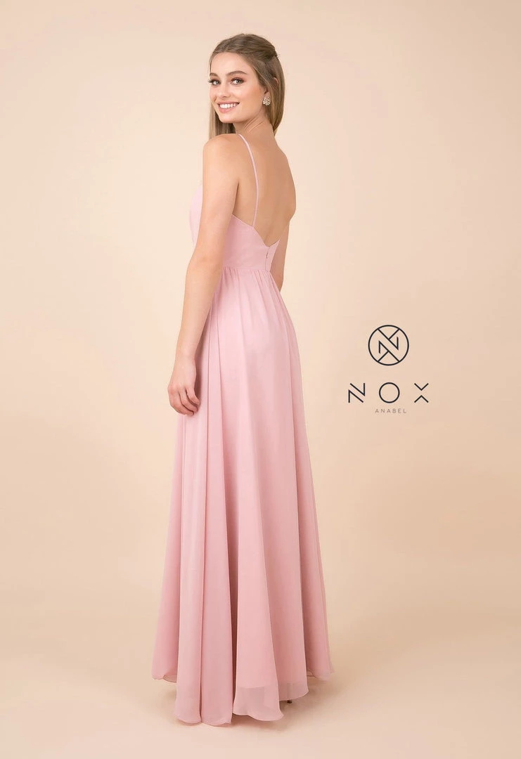 Make lasting memories in this plus size long sleeveless V-neck dress with leg slit by Nox Anabel R275P.