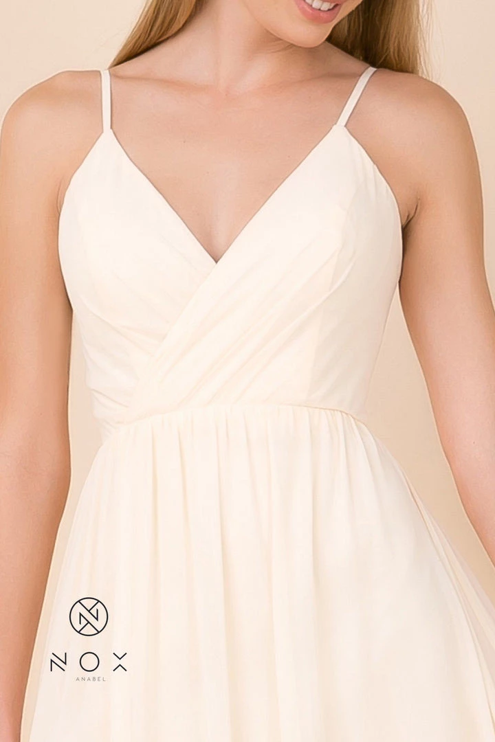 - Pleated V-neck bodice with thin spaghetti straps