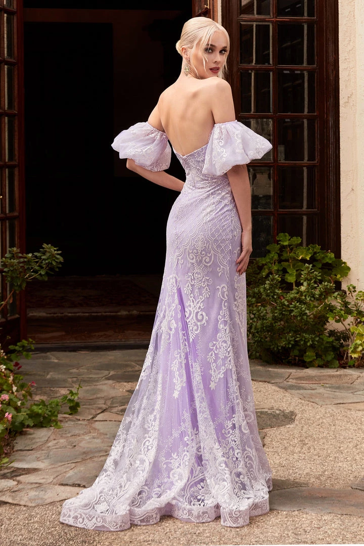 Make lasting memories in this long lace puff sleeve dress with mermaid skirt Cinderella Divine CD958. The mermaid silhouette hugs your figure and displays the intricate lace pattern detail. The strapless illusion lace neckline is accompanied by optional puff sleeves.