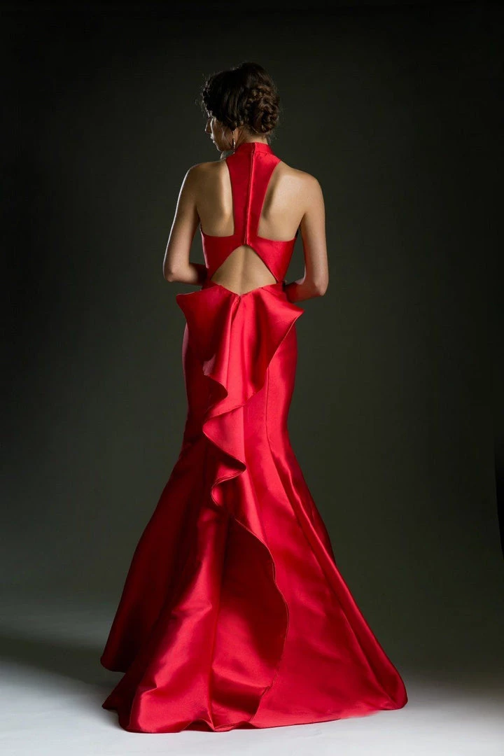 Dance the night away in this long red mermaid dress with sweep train by Cinderella Divine 5172. This satin evening gown features a sleeveless bodice adorned with a choker neckline, flirty cut outs with front keyhole frame the high-neckline, flirty open back with ruffles that cascade to the hem, a floor length mermaid skirt with a sweep train, and a zipper closure.