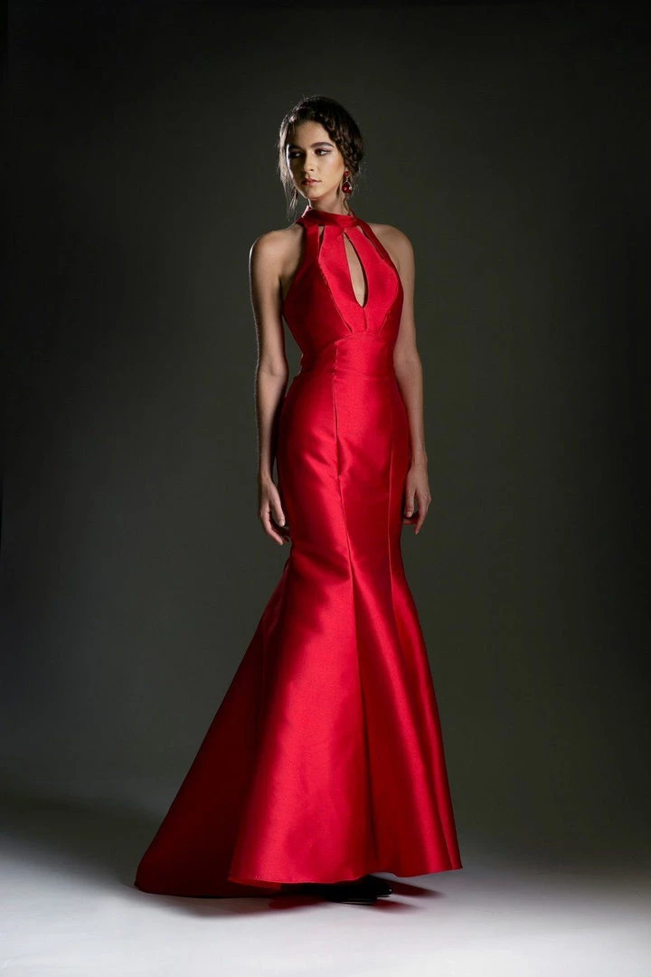 - Fitted mikado mermaid gown with keyhole halter neckline and cutout back