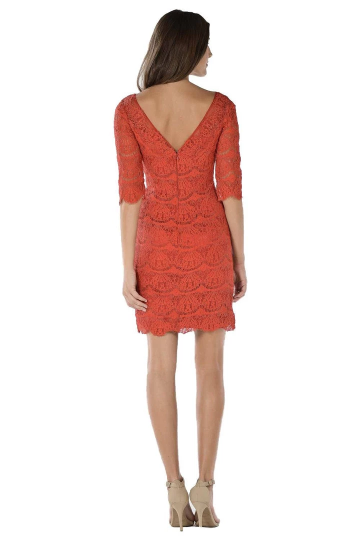 Look flirty and unforgettable in this short red bodycon lace dress with lace mid-sleeves by Poly USA 7654. This lace cocktail dress features a mid-sleeved bodice that is sprinkled with stones for a touch of sparkle. A open V-back, a short above the knee skirt, and a zipper closure complete this beautiful look. Affordably priced at $125, this dress is perfect for any formal event and will keep you on budget!