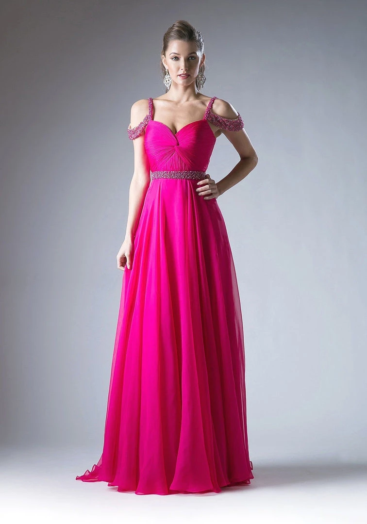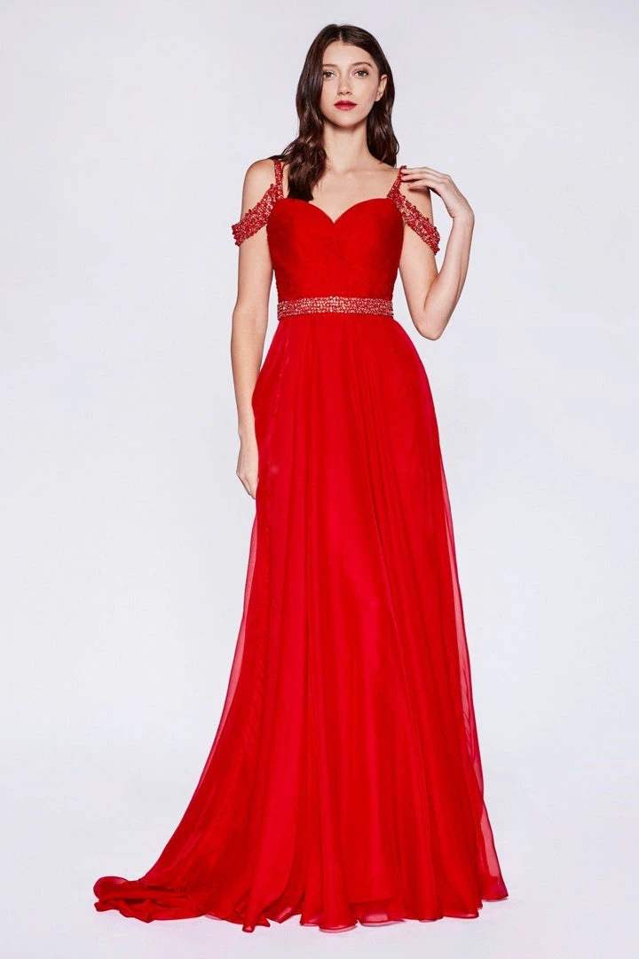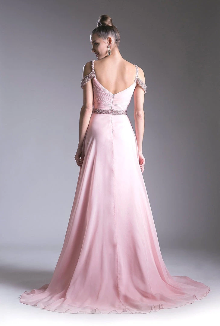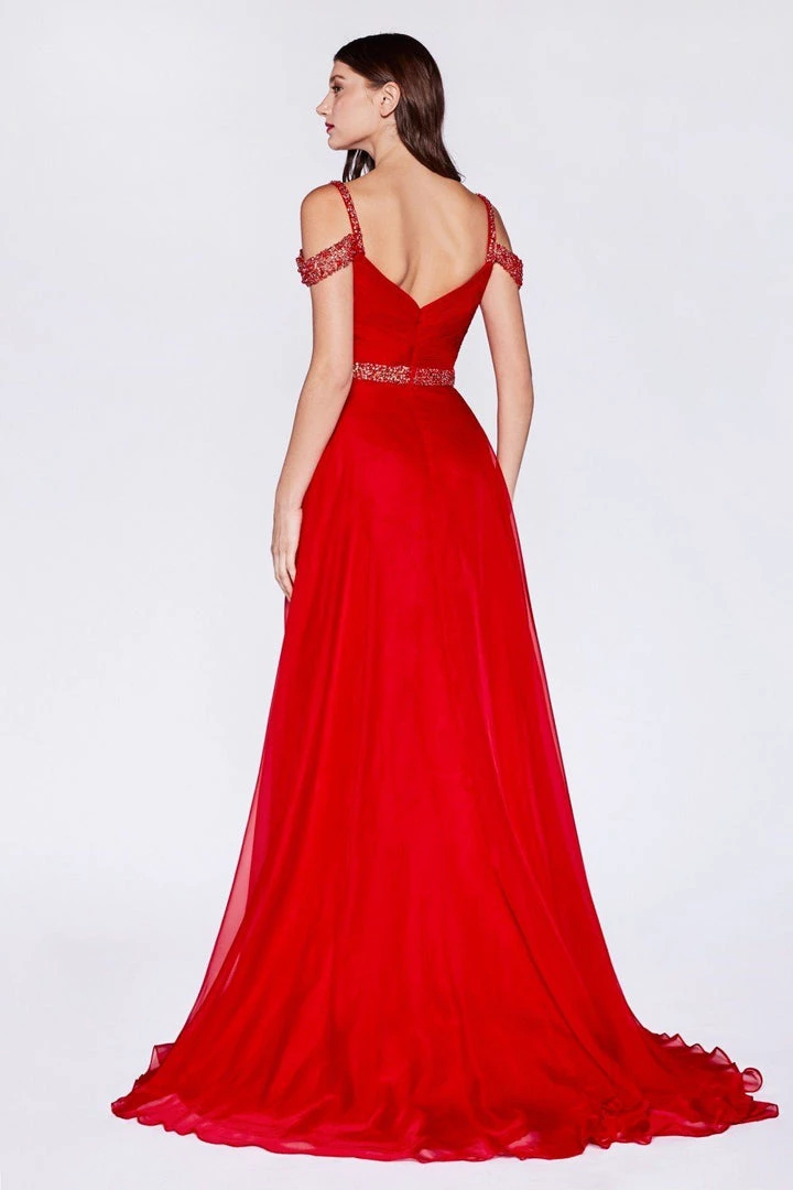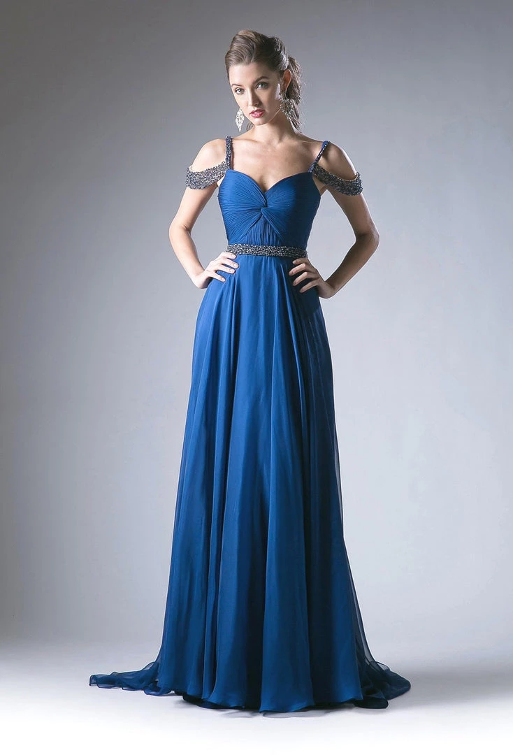 All eyes will be on you in this ruched long cold shoulder dress with A-line skirt by Cinderella Divine P211. This chiffon gown features a twisted ruched off the shoulder bodice with beaded straps, bead embellished waist, open V-back, a floor length A-line skirt, and a zipper closure.