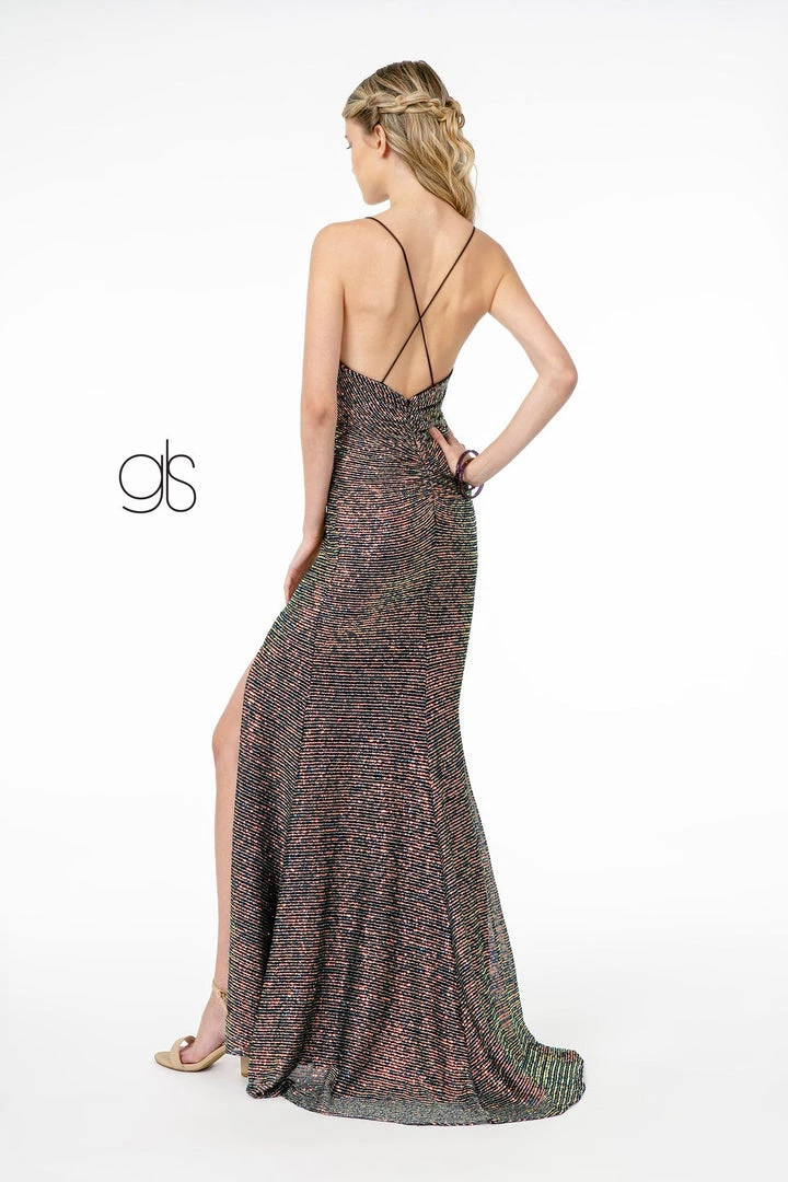 Be selfie ready in this iridescent sequin long sleeveless fitted dress with side slit by Elizabeth K GL1813. Affordably priced at $180, this gown is perfect for any formal event and will keep you on budget!