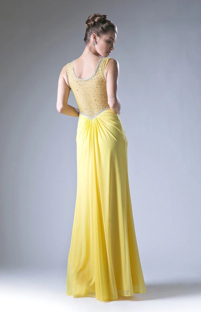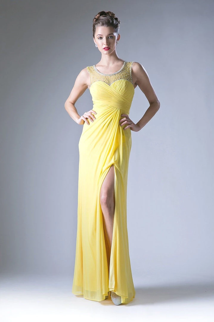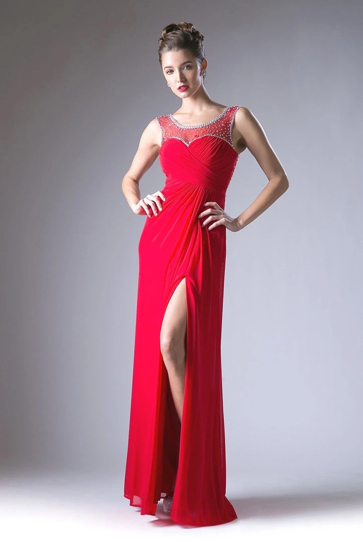 Look radiant in this ruched long illusion dress with side slit by Cinderella Divine XP13.