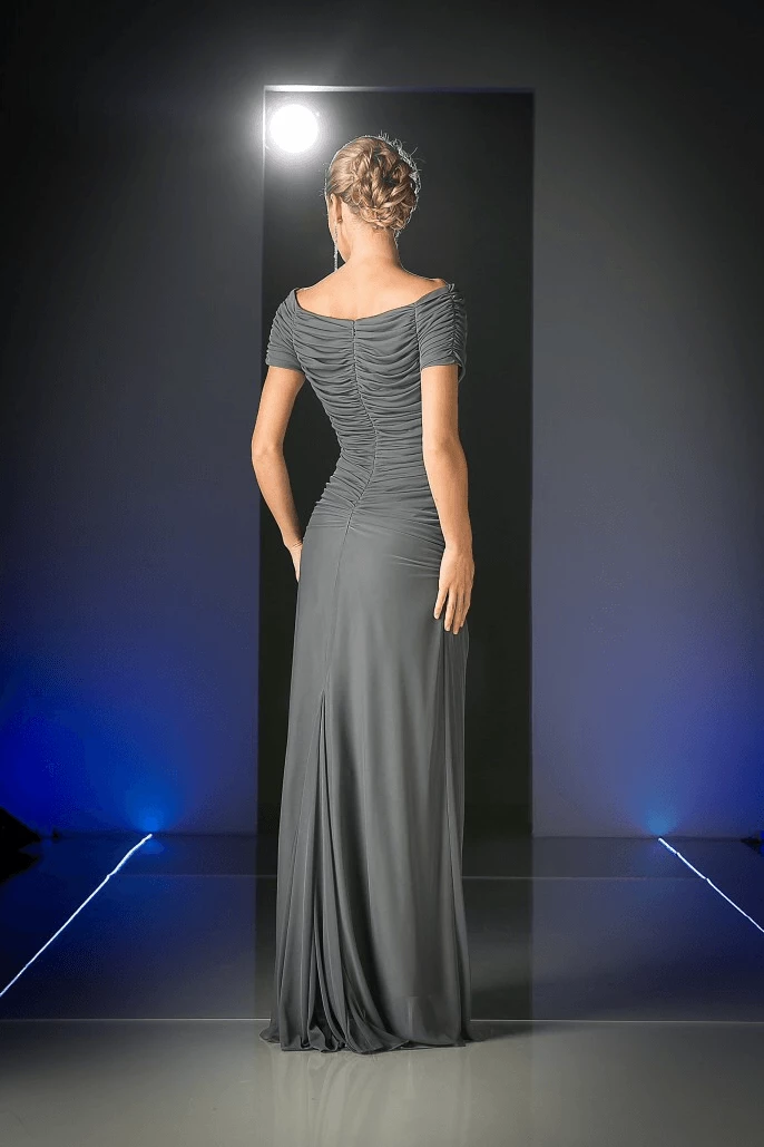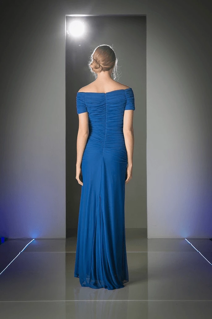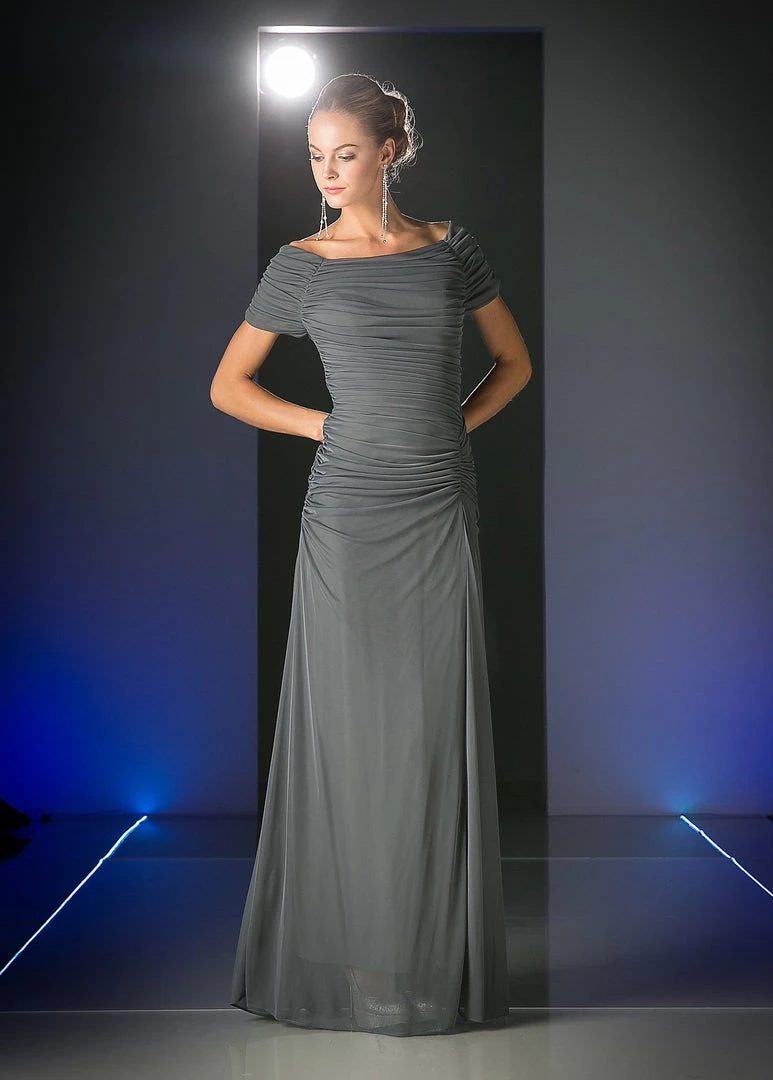 All eyes will be on you in this ruched long off the shoulder dress with short sleeves by Cinderella Divine 3813. Square neckline, short sleeves, and ruched bodice perfect for slimming effect. A-line silhouette with floor length sweeping skirt makes for an elegant, yet simple touch.