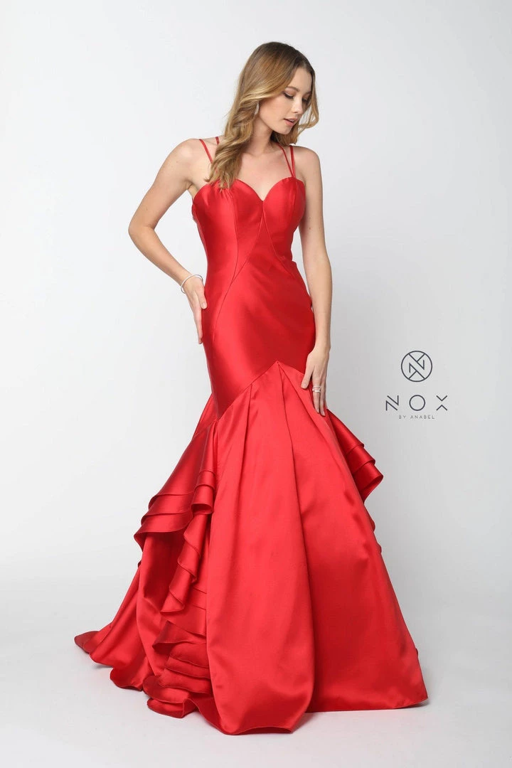 Look selfie-ready in this ruffled mermaid gown with sweetheart neckline by Nox Anabel C034. This evening dress features a sweetheart neckline with double spaghetti straps, crisscross open back, full length mermaid skirt with a ruffled hemline and sweeping train, and a zipper closure. Perfect for any formal event!