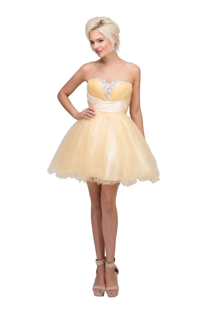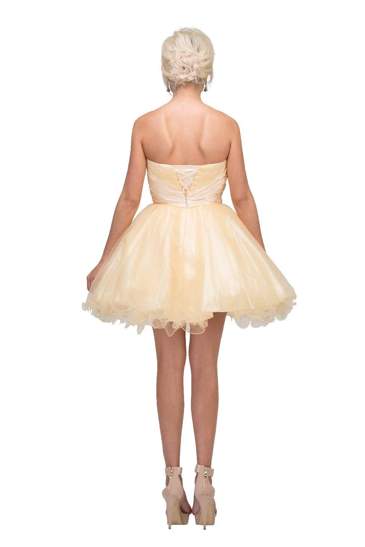 Captivate the room in this beaded strapless sweetheart cocktail dress with corset back by Star Box 591. This beautiful short dress features a strapless bodice embellished with sparkly rhinestones along the sweetheart neckline, ruched satin sash, poofy short ruffled skirt with a curly hemline, and a lace-up corset back with zipper closure. Affordably priced at $135, this short party dress is perfect for any formal event and will keep you on budget!