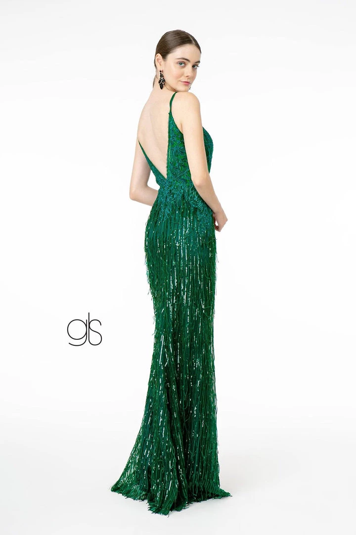 Look radiant in this sequin fringed long sleeveless V-neck dress with trumpet skirt by Elizabeth K GL1824. Affordably priced at $330, this gown is perfect for any formal event and will keep you on budget!