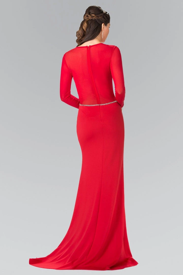 Look radiant in this sheer long sleeved jersey dress with beaded accents by Elizabeth K.