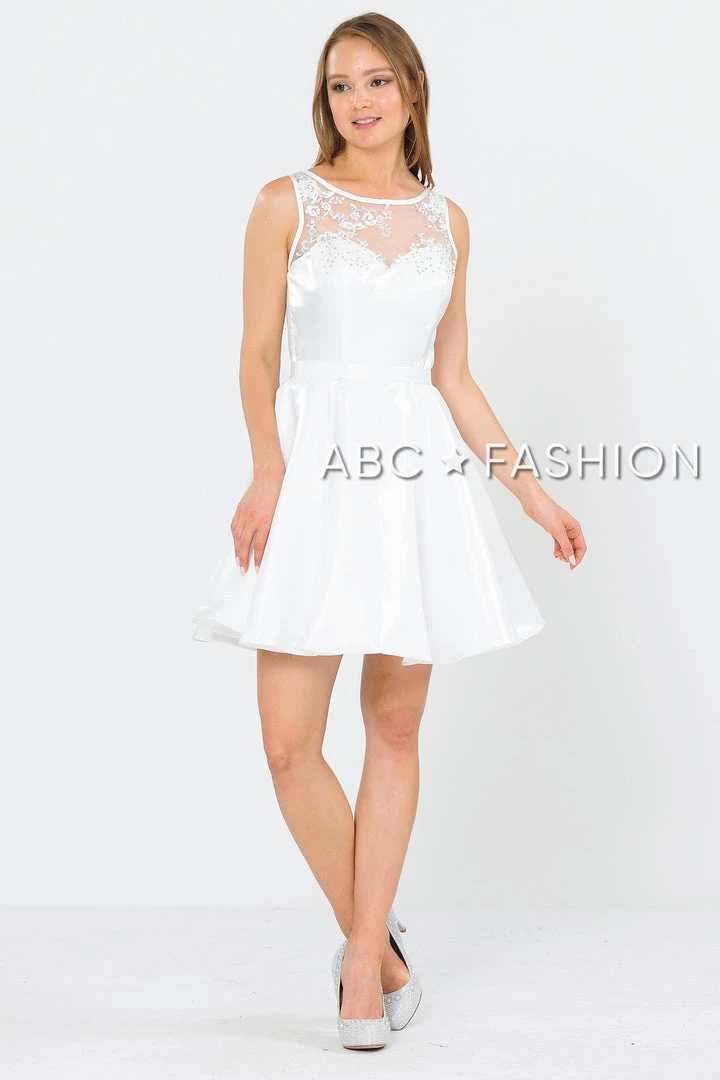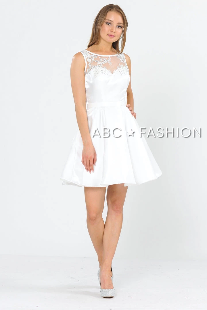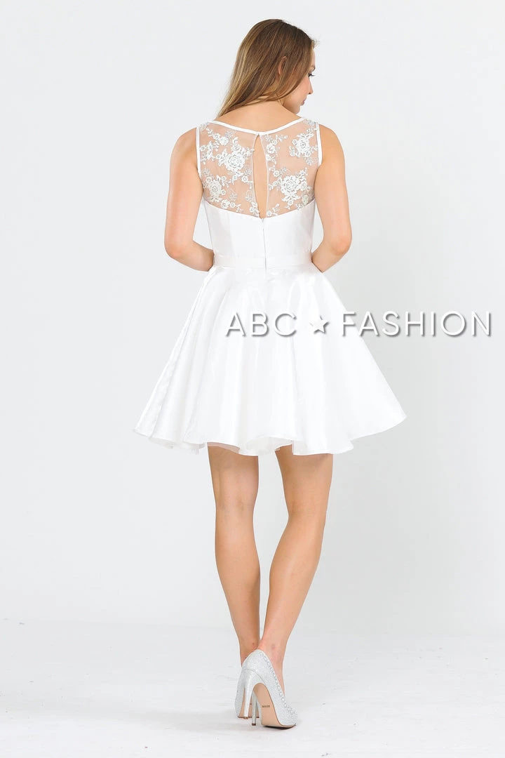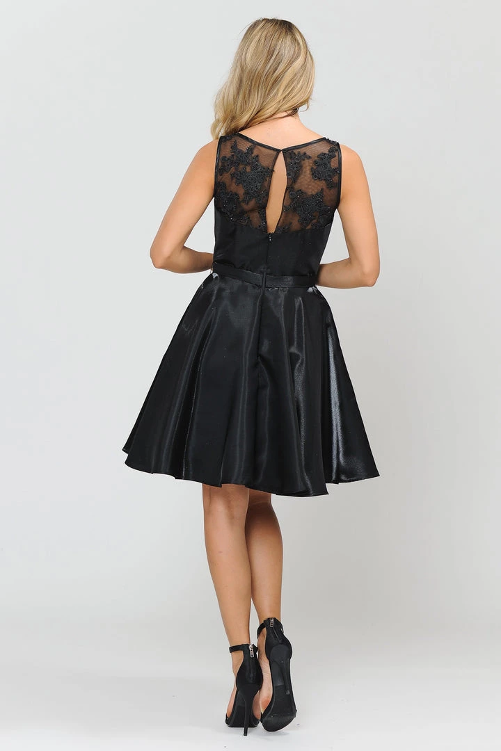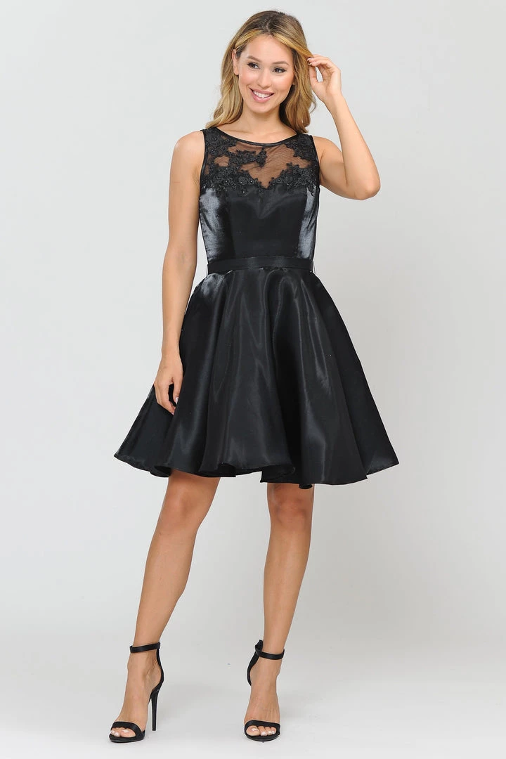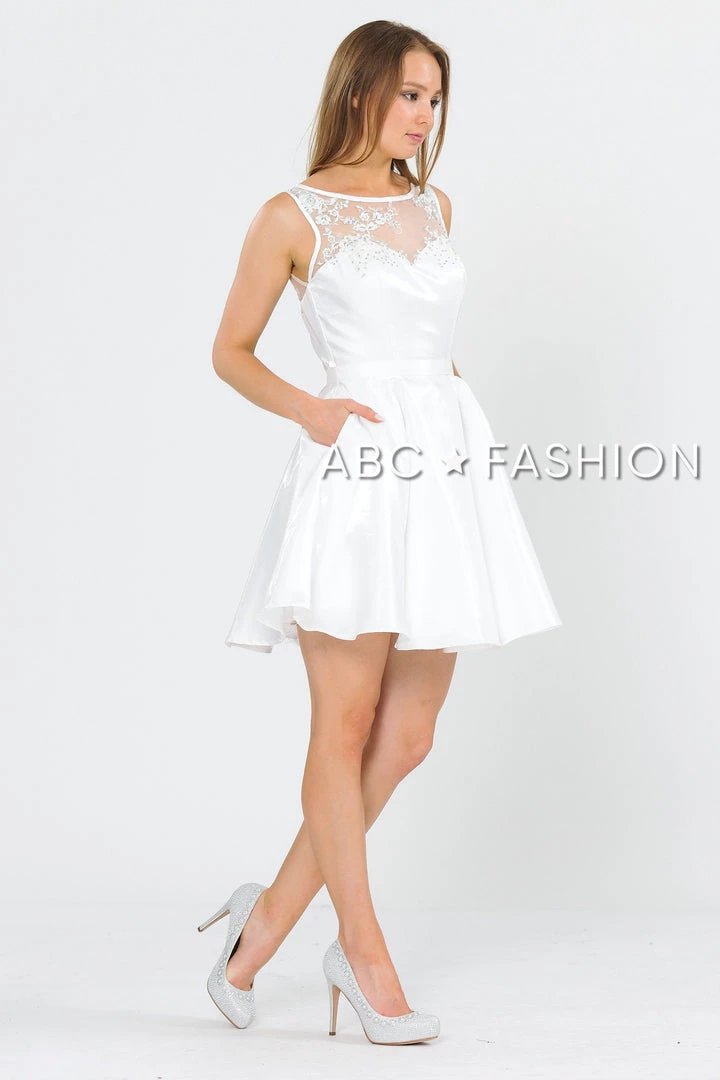 Look super cute in this A-line metallic cocktail dress with embroidered sheer neckline by Poly USA 8318. This beautiful short sleeveless dress features an illusion sweetheart neckline with floral embroidery accented with dainty beads, side pockets, keyhole open back with a sheer embroidered panel, short A-line skirt, and a zipper closure. Affordably priced at $149, this short party dress is perfect for any formal event and will keep you on budget!