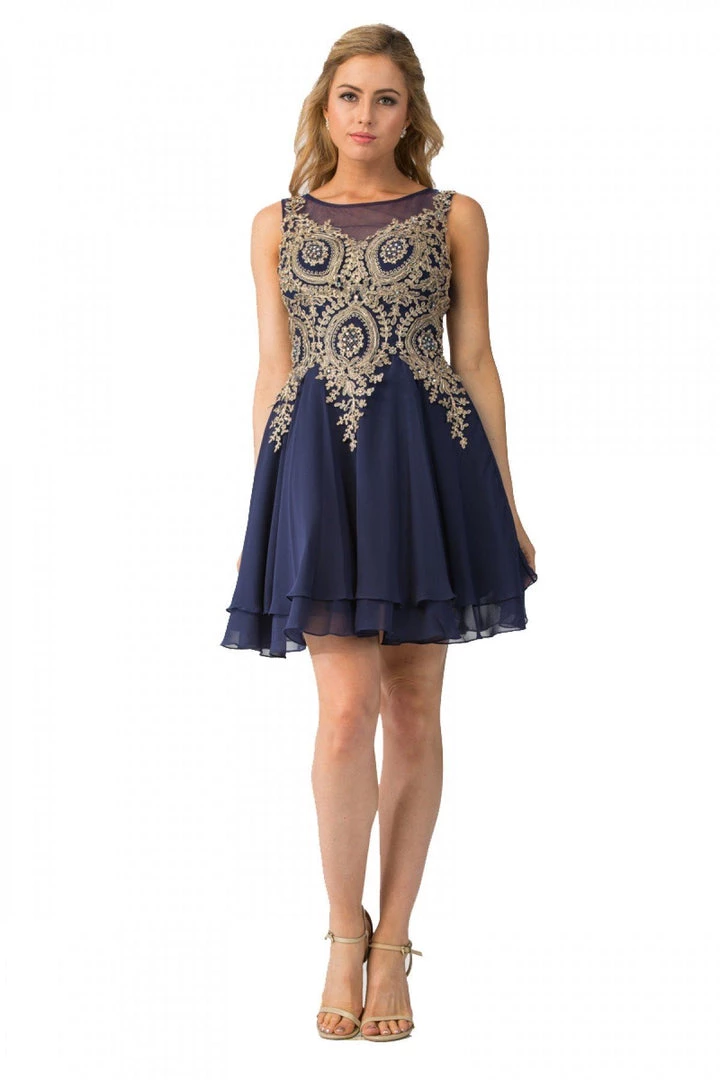 Be selfie-ready in this sleeveless chiffon cocktail dress with gold lace appliques by Star Box 6310. This beautiful short dress features an illusion boat neckline embroidered with metallic gold lace appliques accented with dainty beads, sheer embellished back, short A-line skirt with layers, and a zipper closure. Affordably priced at $155, this short party dress is perfect for any formal event and will keep you on budget!