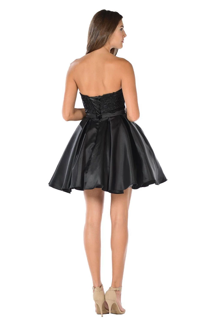 Look picture-perfect in this short strapless blue mikado dress with lace top by Poly USA 7800. This cocktail dress features a strapless sweetheart lace bodice with a thin satin waistband. Versatile side pockets, short A-line skirt, and a lace-up corset back complete this beautiful look. Affordably priced at $160, this dress is perfect for any formal event and will keep you on budget!