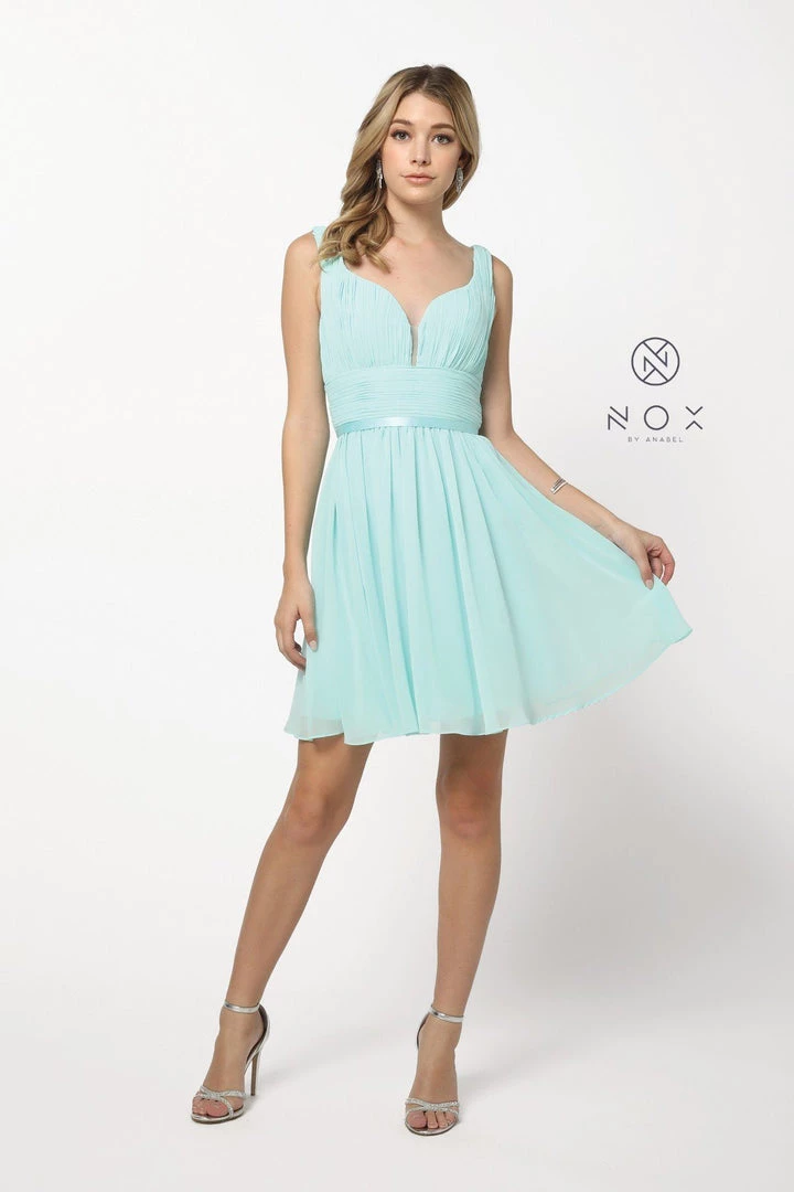 Simply yet fabulous, you will fall in love with this chiffon cocktail dress with ruched bodice by Nox Anabel Style Number 6242. This short party dress features a sleeveless bodice that is beautifully ruched, deep V-neck with a sheer inset, thin satin waistband, short A-line skirt, and a zipper closure.