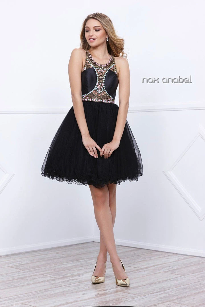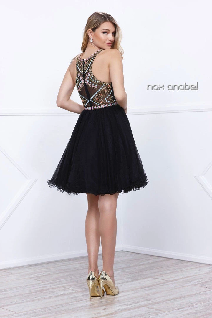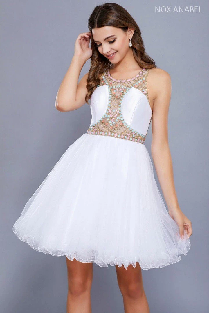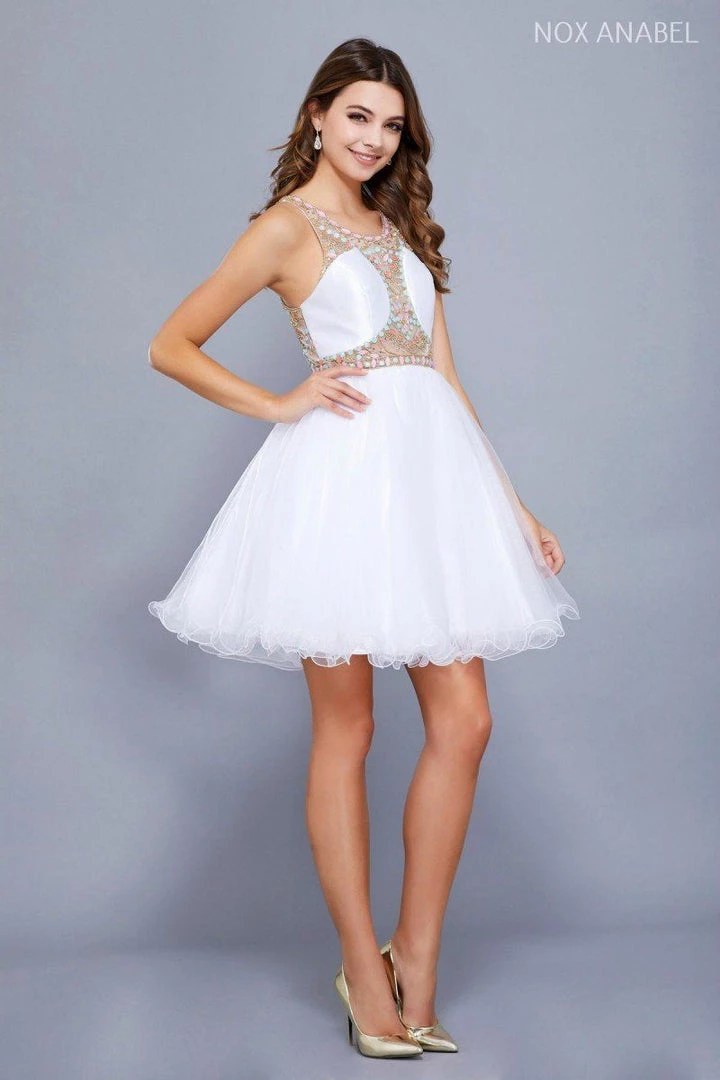 Look super cute in this illusion cocktail dress with beaded bodice by Nox Anabel Style Number 6250. This short party dress features a scoop-neck sleeveless bodice adorned with lovely pastel-colored beads, sheer illusion neckline, beautiful embellished racerback, a short flirty skirt with ruffled edges, and a zipper closure. Perfect for any semi-formal event!