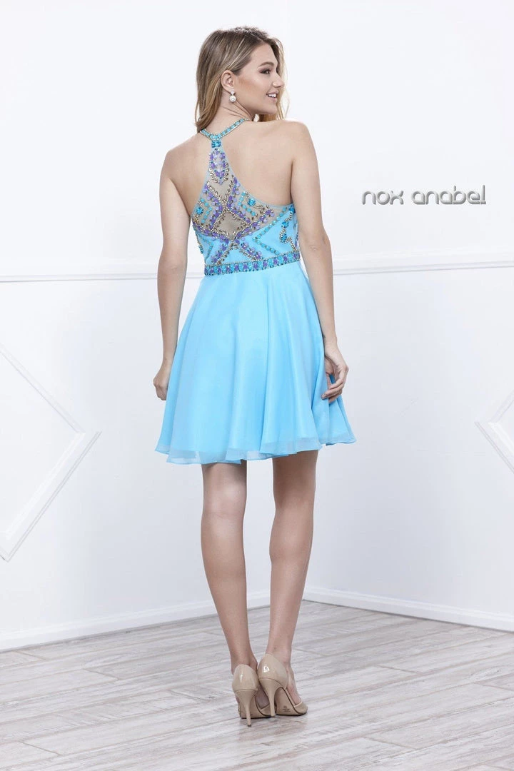 Fall in love with this short illusion cocktail dress with multi-colored beaded bodice by Nox Anabel Style Number 6238. This short cocktail dress features a high-neck sleeveless bodice adorned with pastel-colored beads, sheer illusion neckline, short flirty straight skirt, a fun racerback, and a zipper closure.