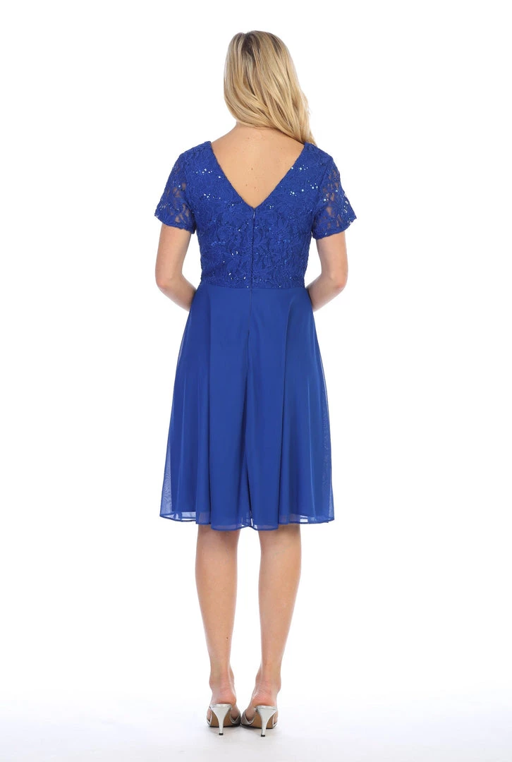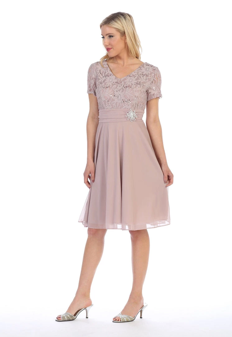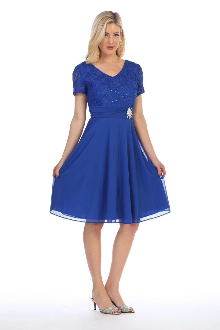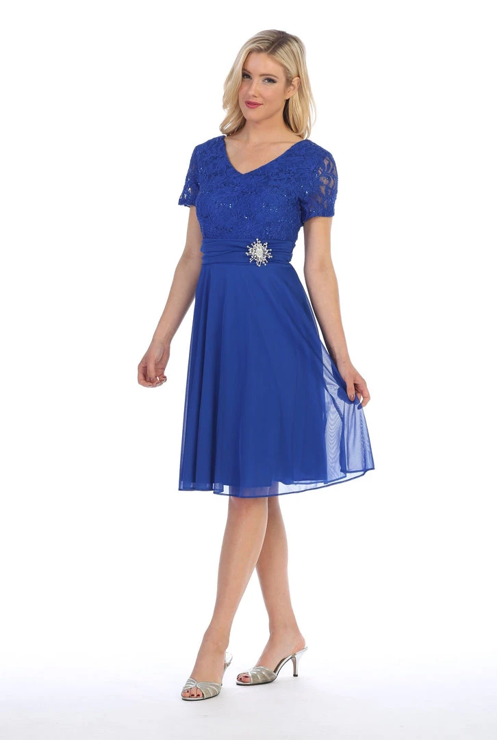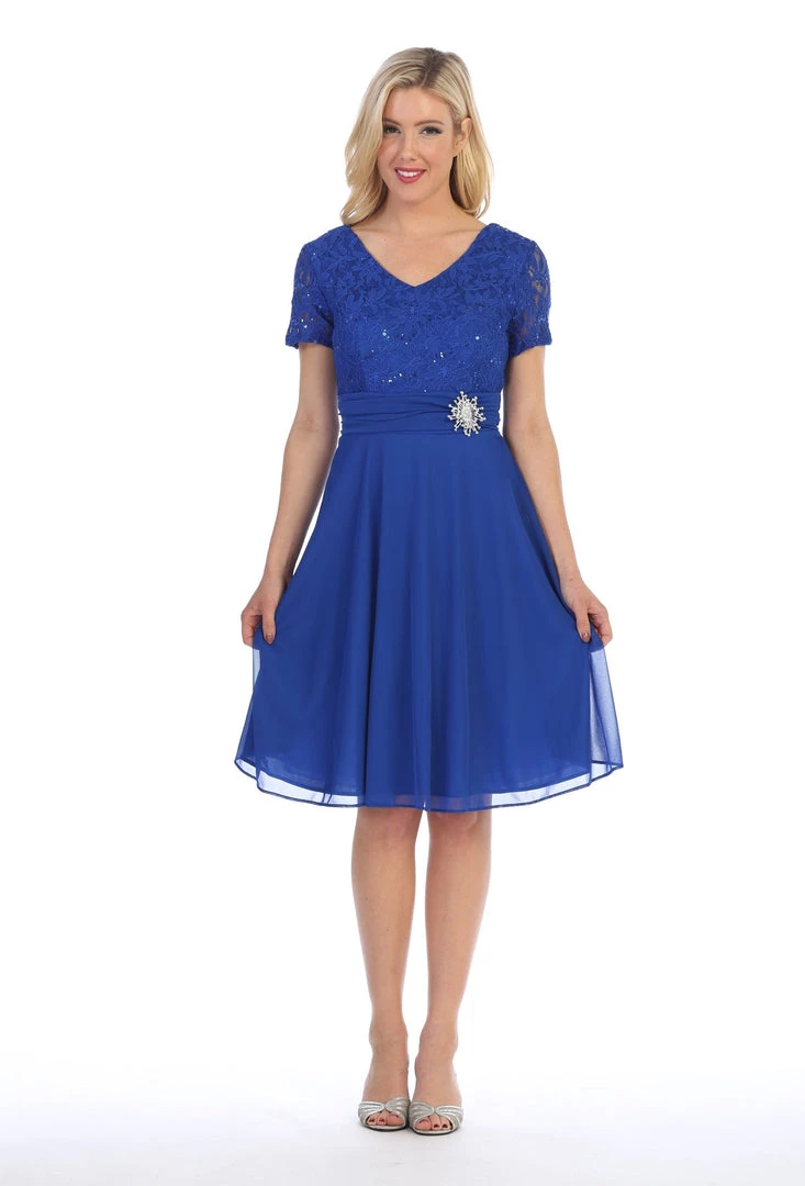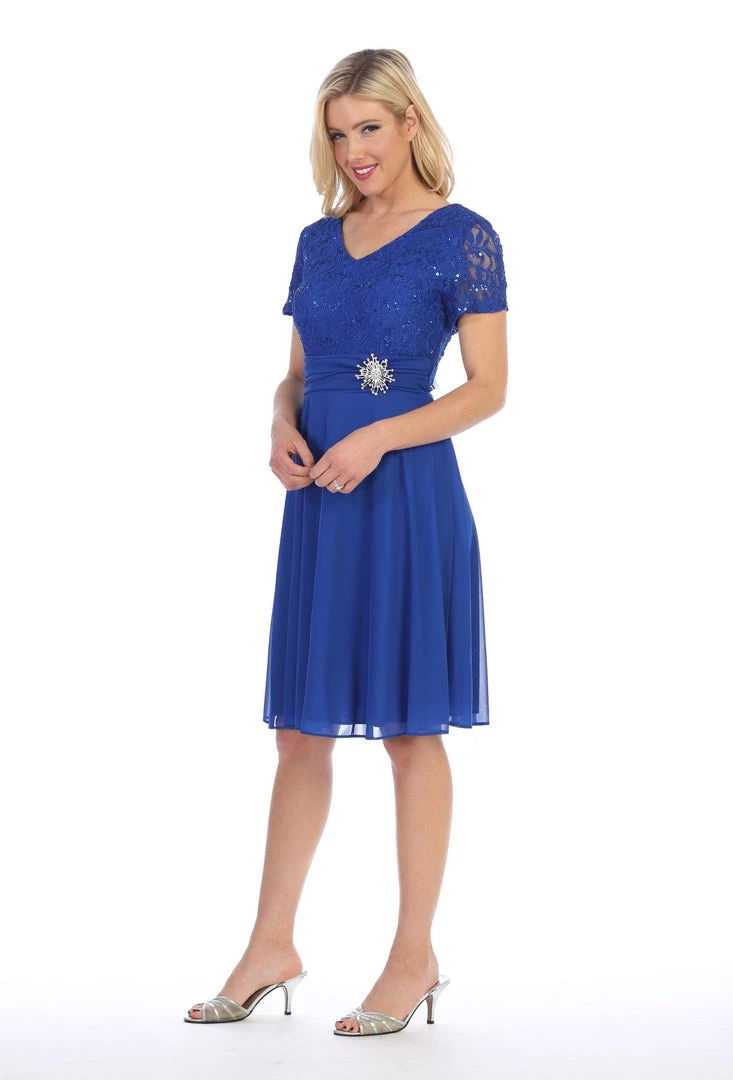 Captivate the room in this short-sleeved cocktail dress with lace bodice by Celavie 6320-S. This beautiful knee length dress features a V-neck lace bodice with short sleeves, a ruched satin waistband adorned with a sparkly brooch, short A-line chiffon skirt that falls at the knees, and a zipper closure. Affordably priced at $99, this short party dress is perfect for any formal event and will keep you on budget!