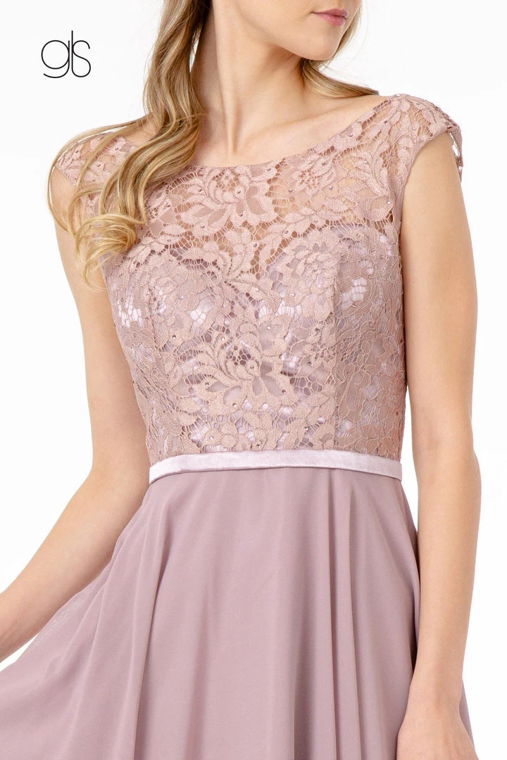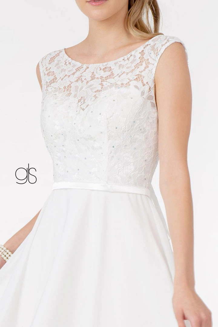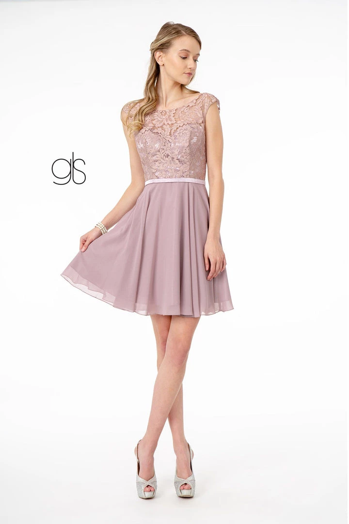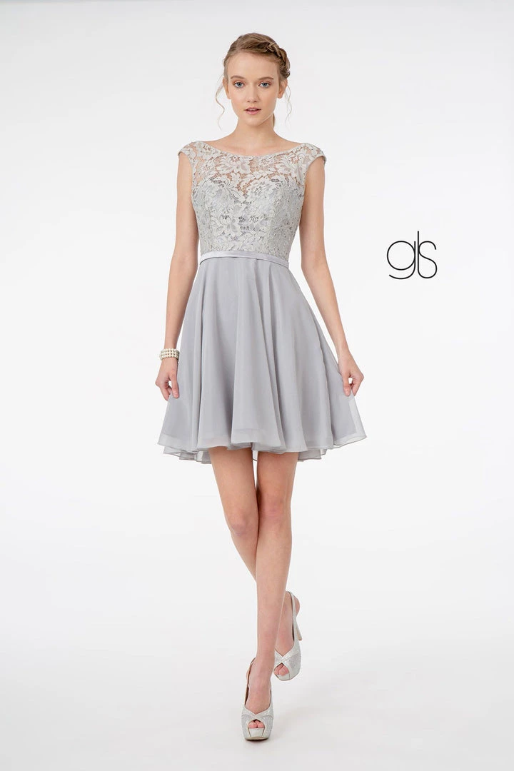 - Lace Embellished Bodice Chiffon Short Cocktail Dress