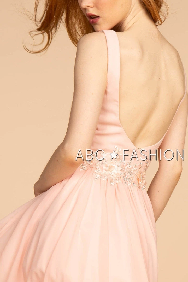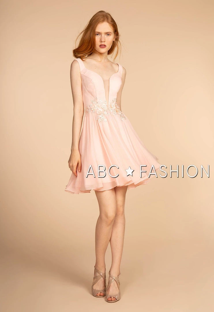 You’ll love twirling around in this pink V-neck cocktail dress with floral embroidered waist by Elizabeth K GS1617. This short party dress features a sleeveless bodice with a V-neckline that plunges to the natural waistline and is supported by a sheer inset panel, the waist is embroidered with 3-D floral appliques accented with beads, the layered short A-line chiffon skirt that elegantly moves, and a zipper closure. Affordably priced at $140, this dress is perfect for any semi-formal event and will keep you on budget!