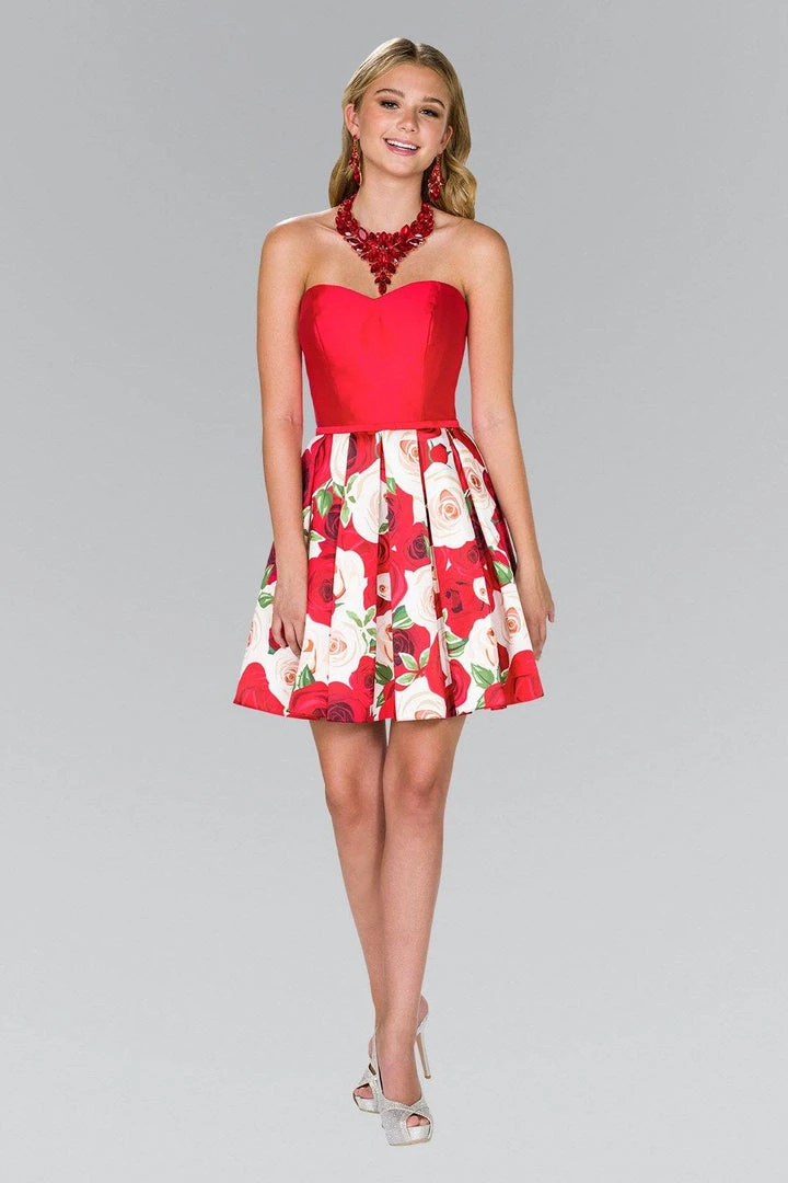 Look super cute in this red strapless floral print cocktail dress by Elizabeth K GS2385. This short party dress features a strapless sweetheart bodice adorned with lovely floral beading, the thin solid band around the waist creates a slimming look, a lovely short A-line box pleated skirt covered in a vibrant red and cream rose print pattern, and a zipper back. Perfect for any semi-formal event!