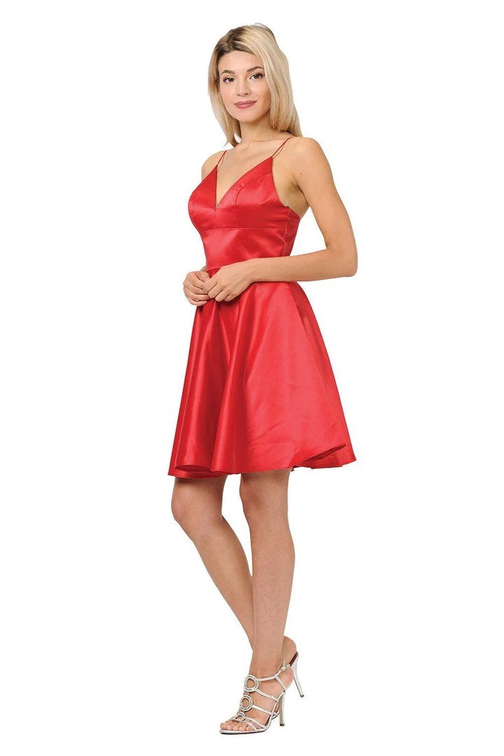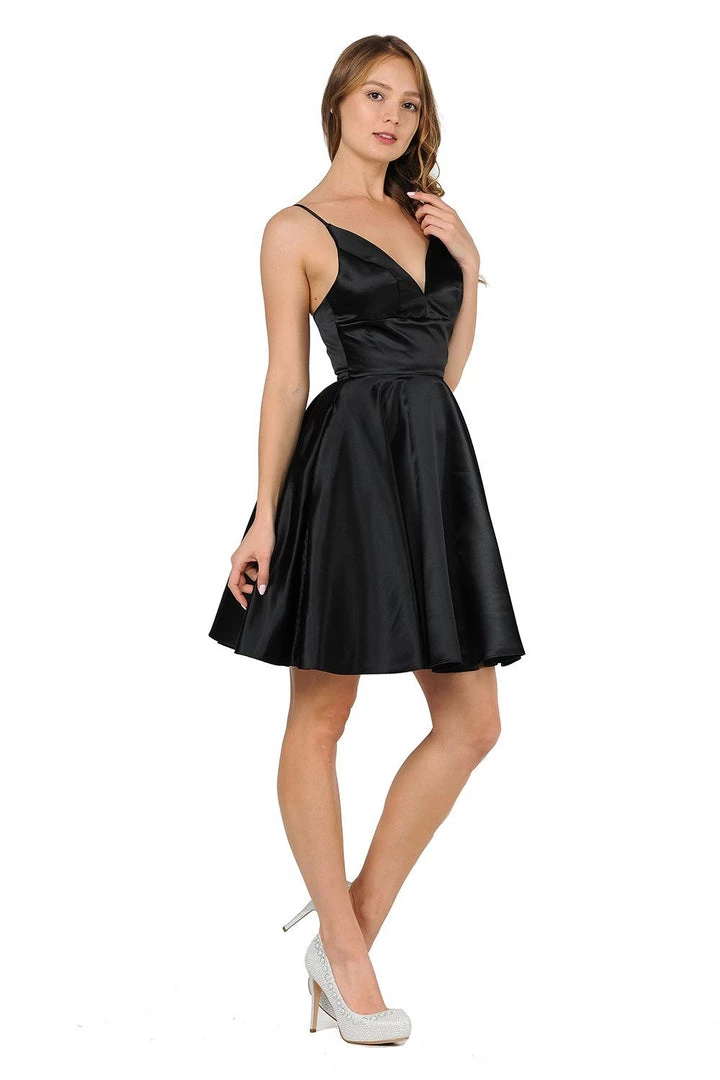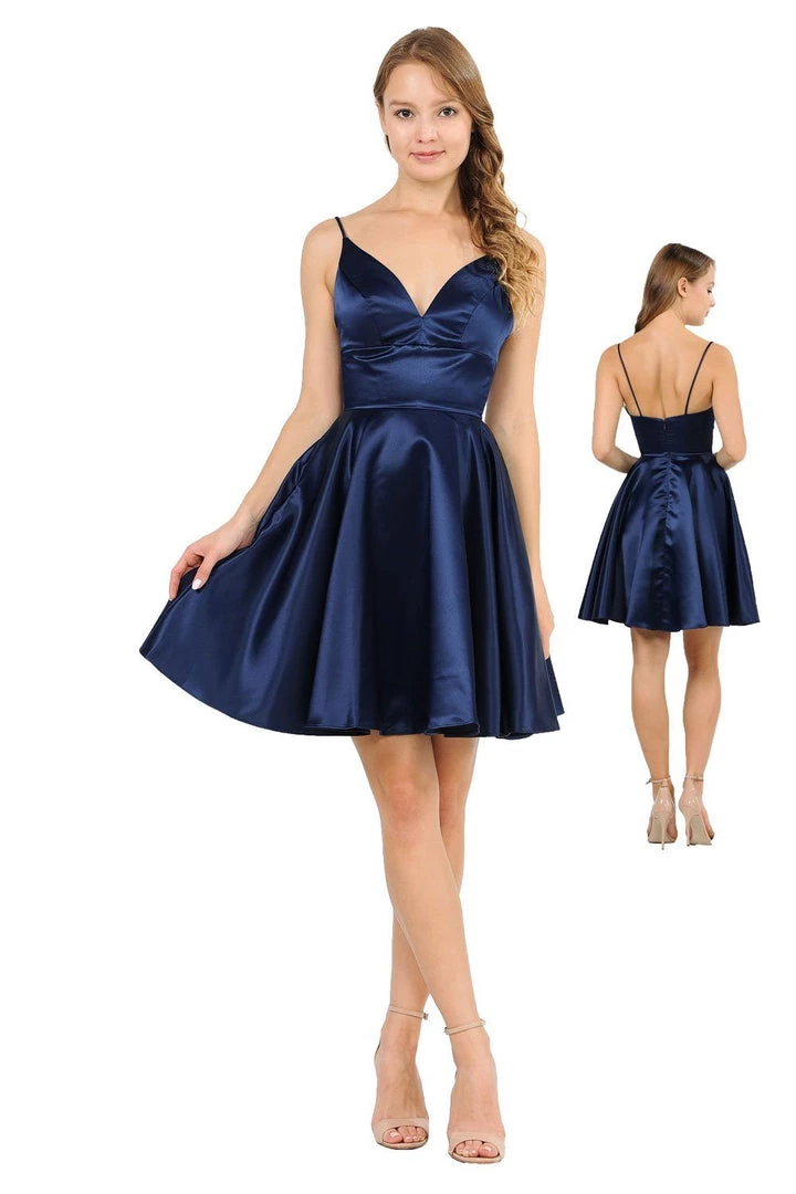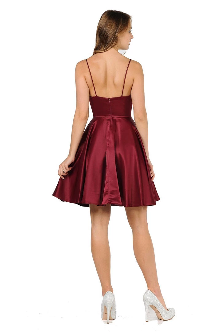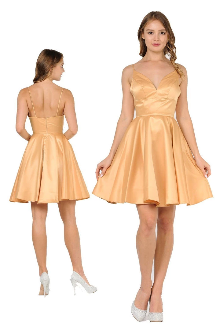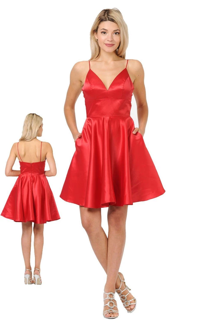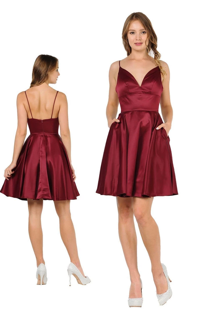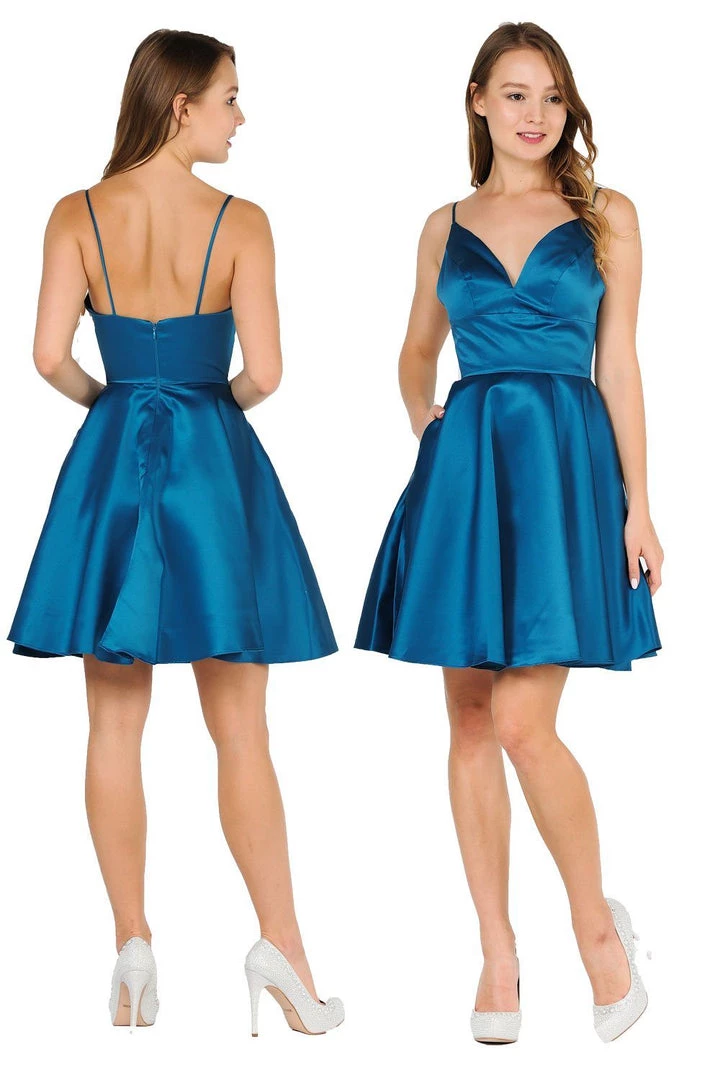 Be a trendsetter in this short sweetheart dress with side pockets by Poly USA 8374. Beautiful short A-line satin dress with sweetheart neckline and spaghetti shoulder straps. Center back zipper closure and side pockets. Affordably priced at $115, this short dress is perfect for any semi-formal event and will keep you on budget!
