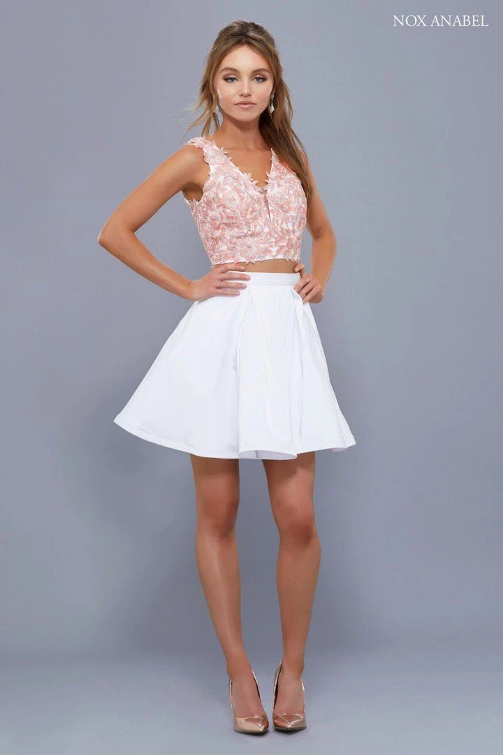 Look gorgeous in this two-piece cocktail dress with floral embroidery by Nox Anabel Style Number 6344. This short party dress features a sleeveless V-neck crop-top adorned with a beautiful beaded floral embroidery, a sheer panel inset, a flirty open back, a short white box pleated skirt, and a zipper closure. Perfect for any semi-formal event!