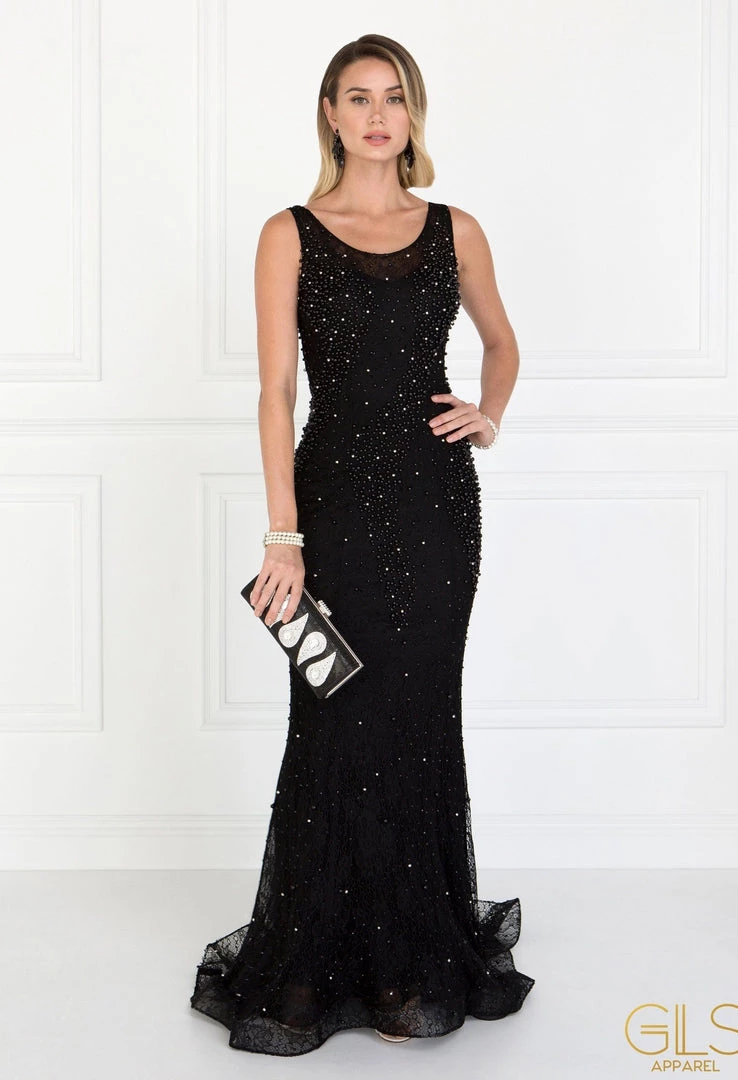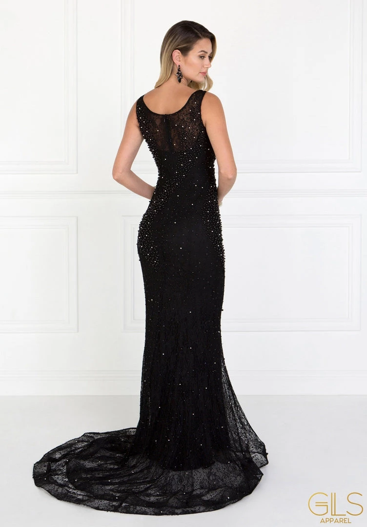Look red carpet ready in this black lace mermaid gown with train by Elizabeth K GL1544. Sleeveless full lace dress with a scoop neckline and a mermaid silhouette. Covered back with zipper close. Galaxy jewels and beaded details on a solid one tone. Perfect for any formal event!