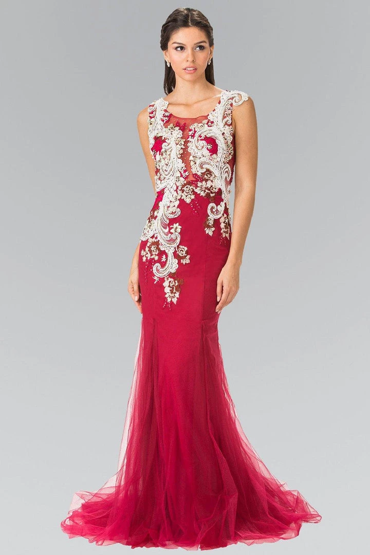 Make a grand entrance in this sleeveless embroidered illusion mermaid dress by Elizabeth K.