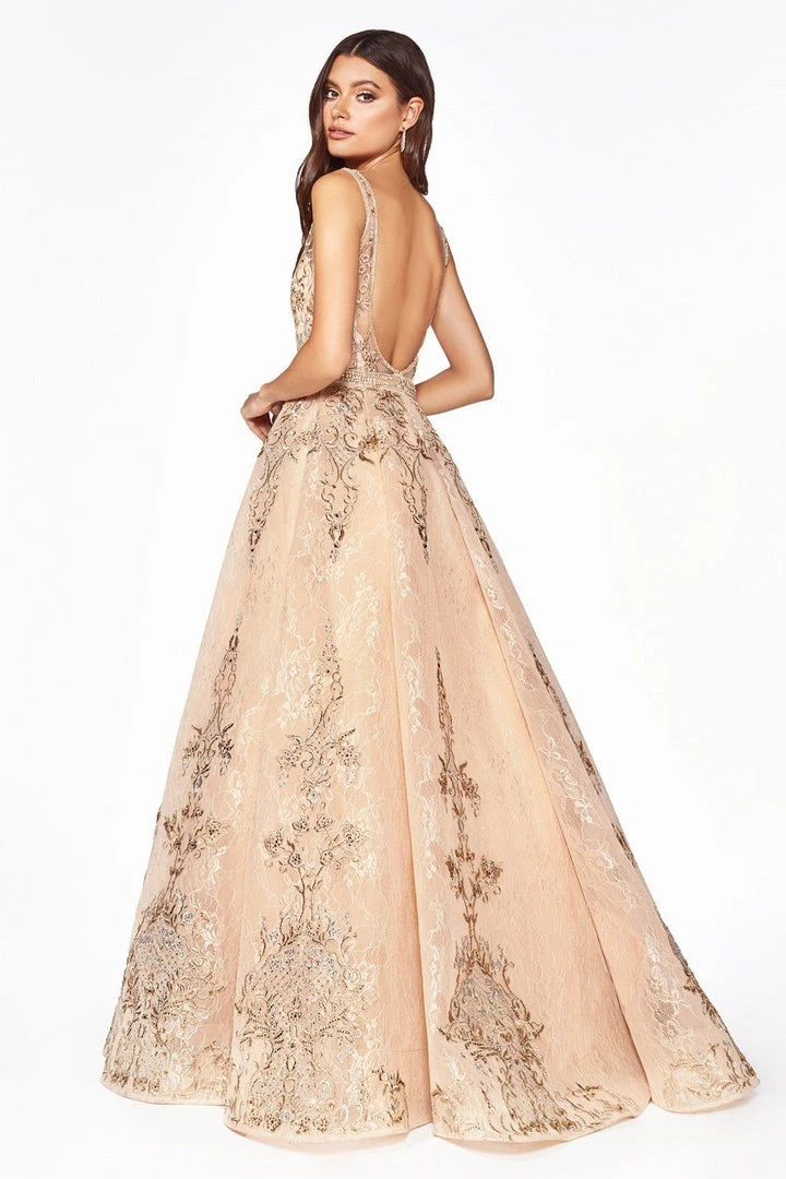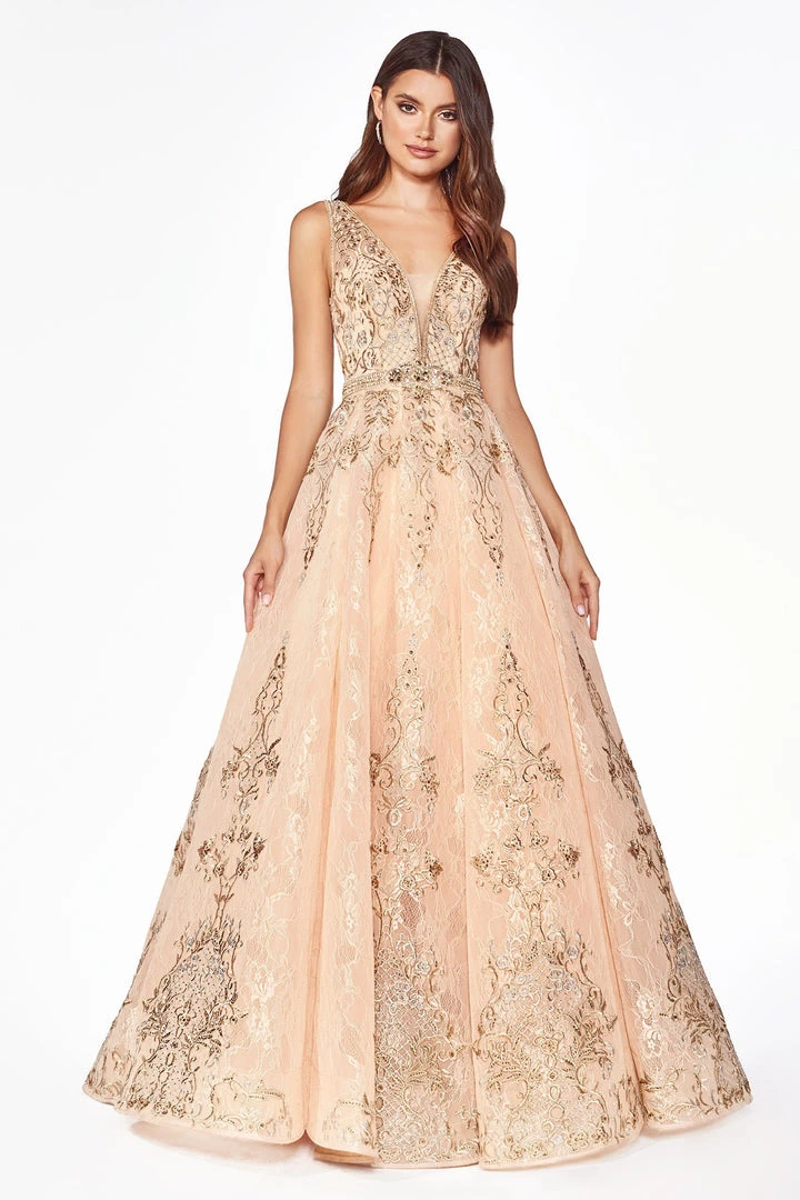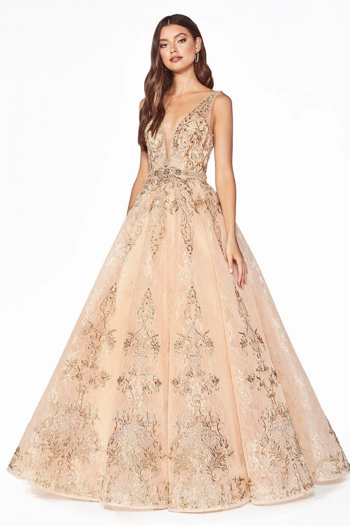 Be the center of attention in this long A-line lace dress with beaded appliques by Cinderella Divine CK801.