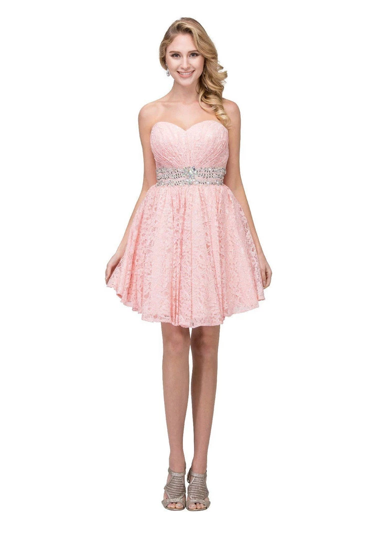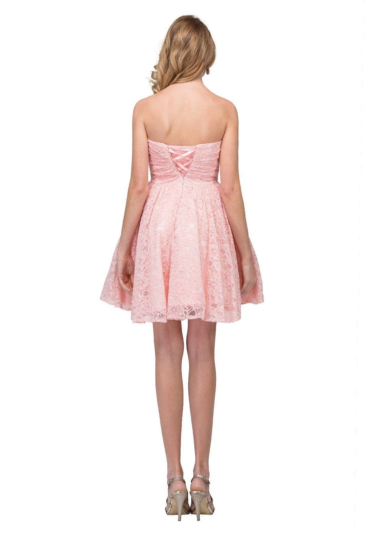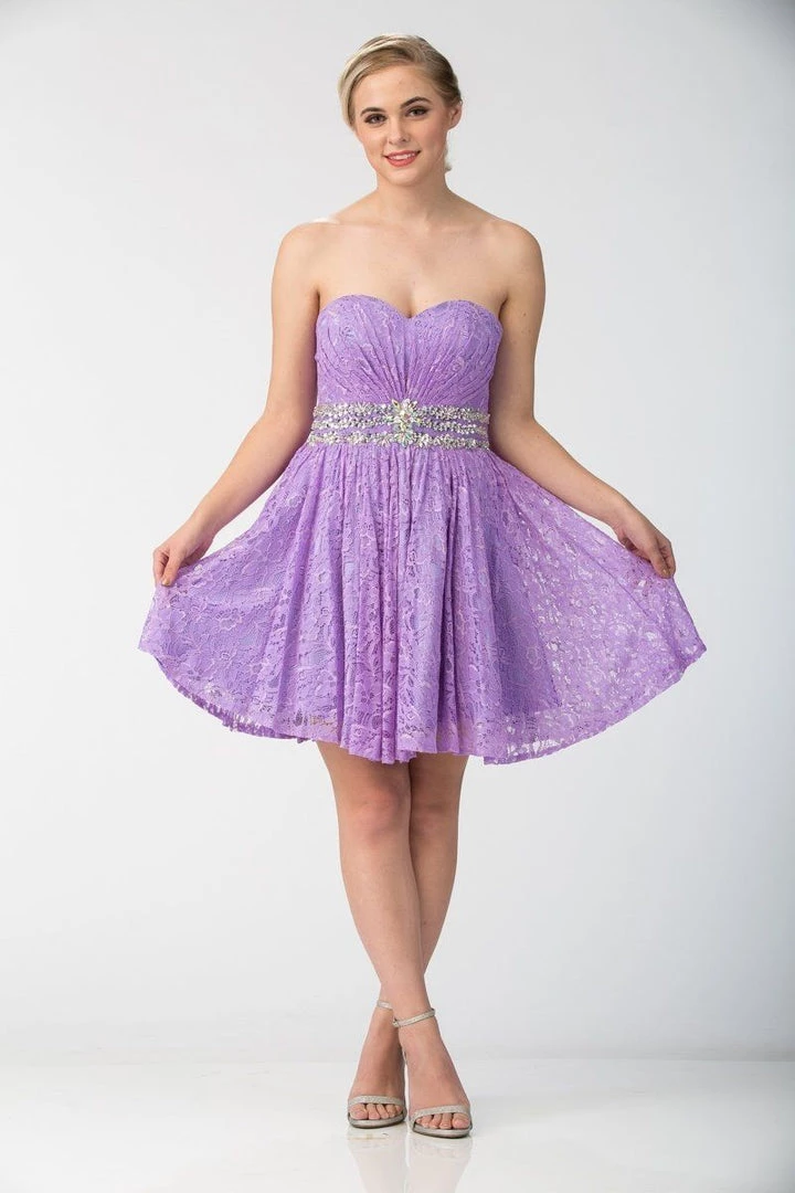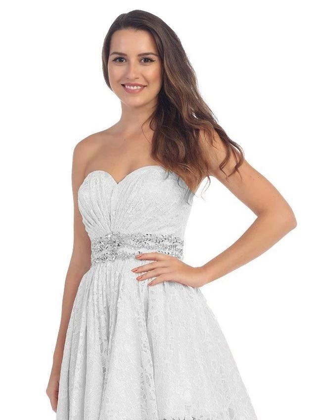 Look unforgettable in this strapless sweetheart lace cocktail dress with corset back by Star Box 6153. Made out of lovely lace, this beautiful short empire waist dress features a ruched strapless sweetheart neckline, sparkly beaded details on the waist, short A-line skirt, and a lace-up corset back with zipper closure. Affordably priced under $160, this short party dress is perfect for any formal event and will keep you on budget!
