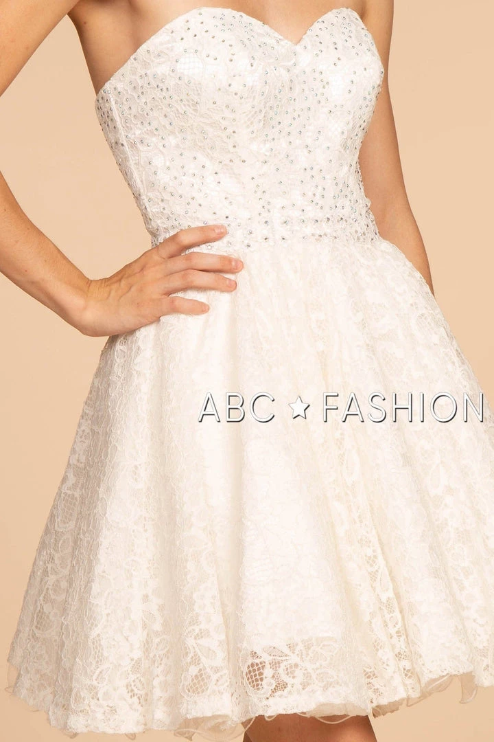 Be selfie-ready in this strapless sweetheart lace cocktail dress with corset lace-up back by Elizabeth K GS1611. This short party dress features a strapless sweetheart bodice embellished with sparkling rhinestones, a short A-line lace skirt gently falls above the knees, and a lace-up corset back with cutouts for a touch of flirtiness. Affordably priced at $140, this dress is perfect for any semi-formal event and will keep you on budget!