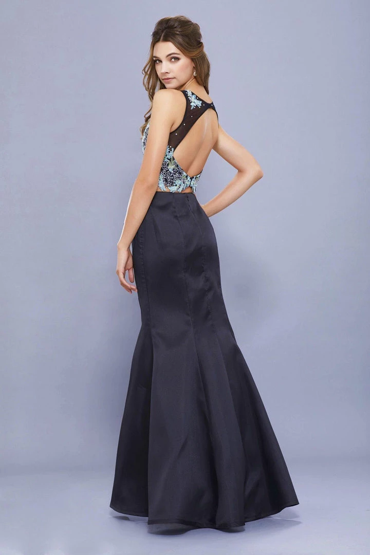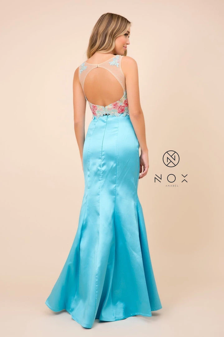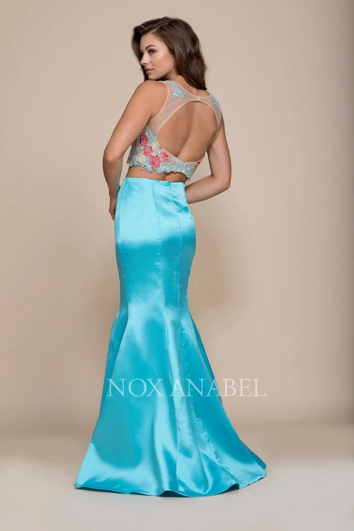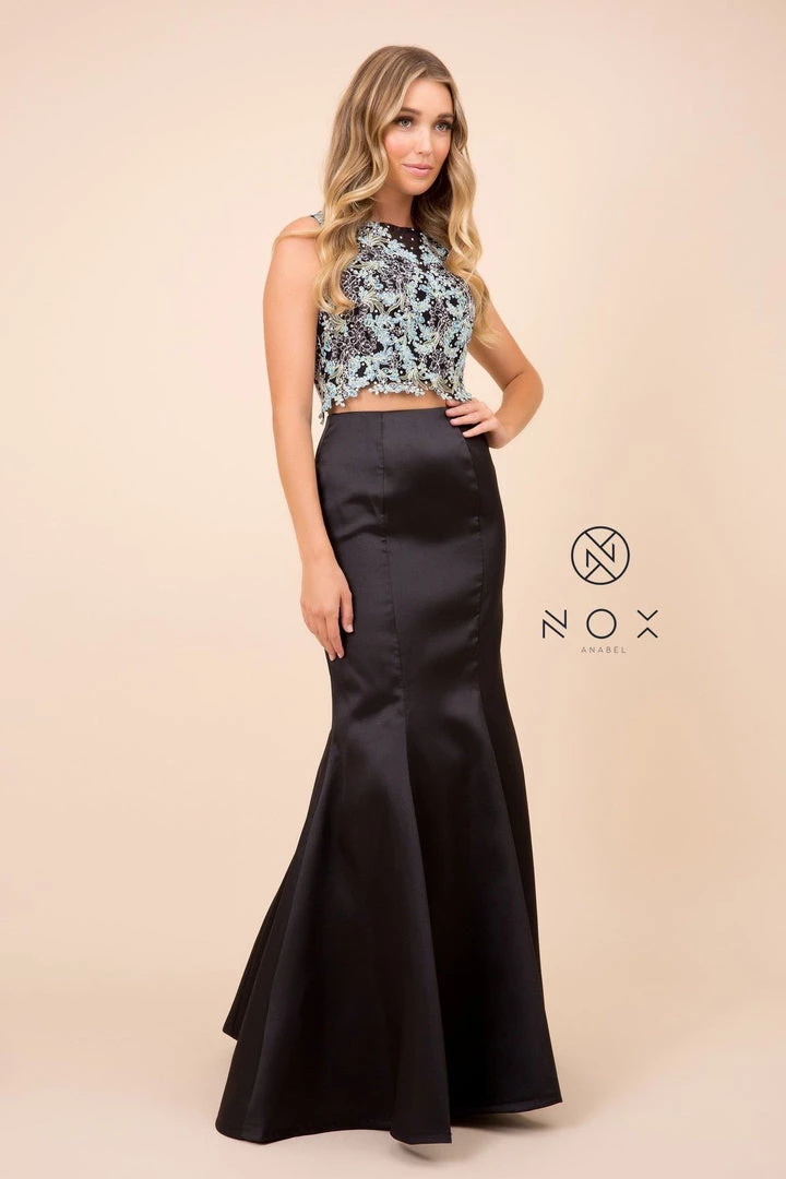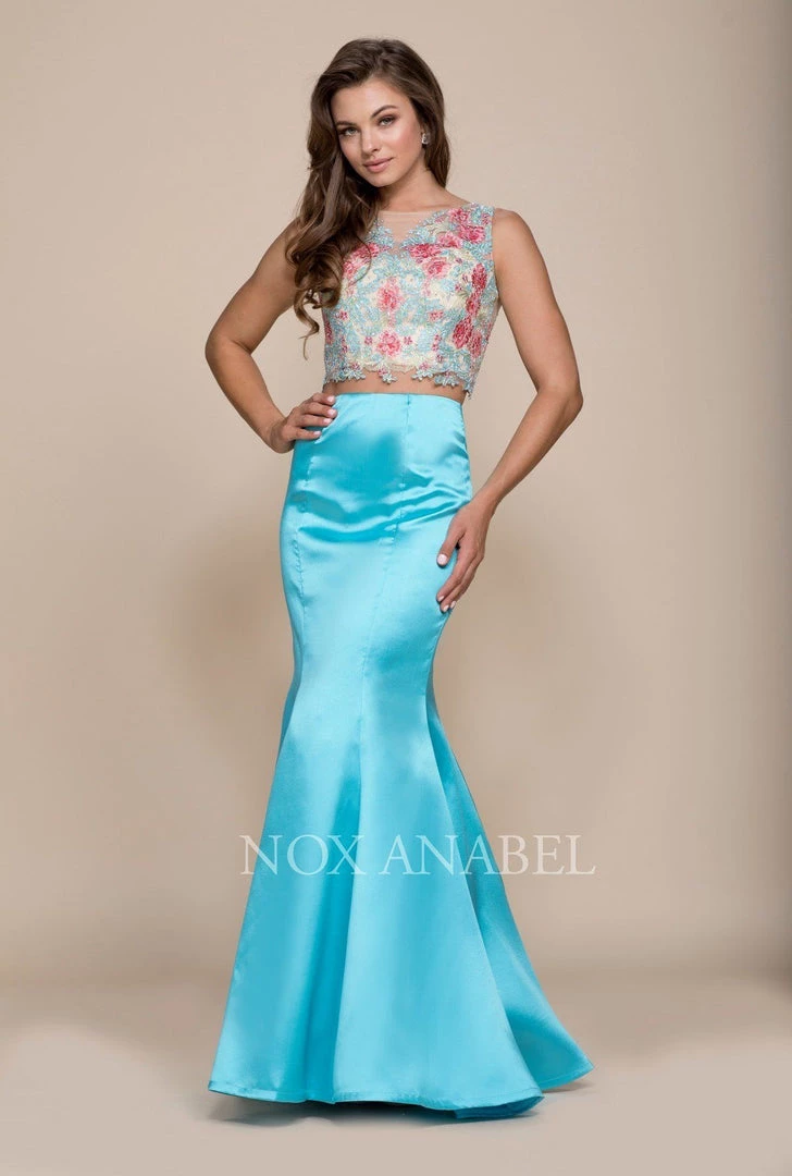 You’ll love wearing this long two-piece crop top dress with floral lace top by Nox Anabel 8287. This long evening gown features a high-neck sleeveless crop-top with sheer illusion neckline, beautiful floral print lace embroidery, long luxurious satin mermaid skirt, a sexy open back, and a zipper closure. Affordably priced under $150, this dress is perfect for any formal event and will keep you on budget!