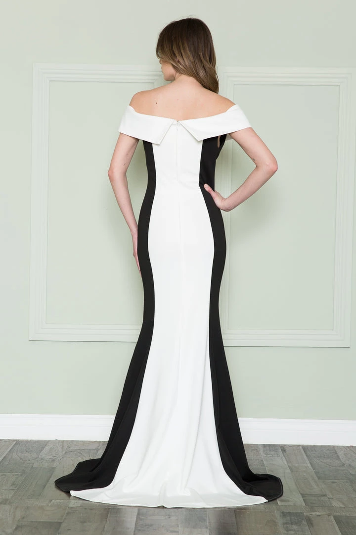 Look picture perfect in this two-tone long off the shoulder fitted dress with leg slit by Poly USA 8924. This beautiful gown features an off shoulder sweetheart bodice, open back, floor length form fitting skirt with a sweep train, side leg slit, and a zipper closure.