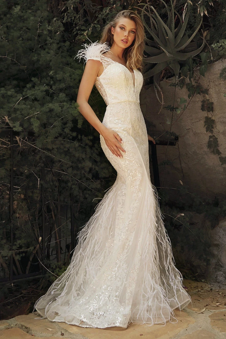 Be selfie ready in this feather glitter print off white mermaid dress by Cinderella Divine C57W. Glitter floral print mermaid evening gown with luxe faux feather embellishments, V-neckline, and open back.