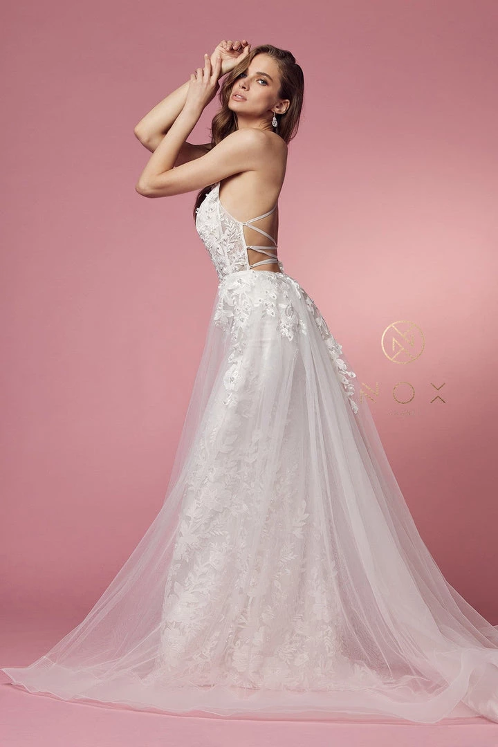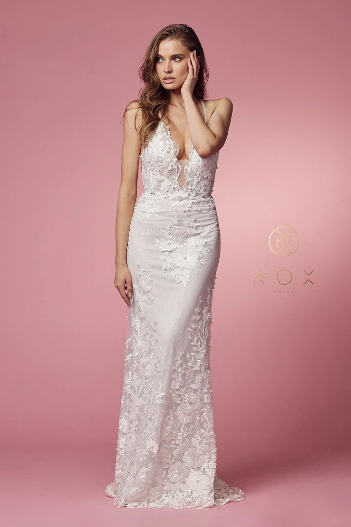 Make a statement in this lace applique long deep V-neck fitted white dress with A-line overskirt by Nox Anabel F485W. With the stunning attention to details, you’ll love the hand-beaded floral details embellished throughout this gown.
