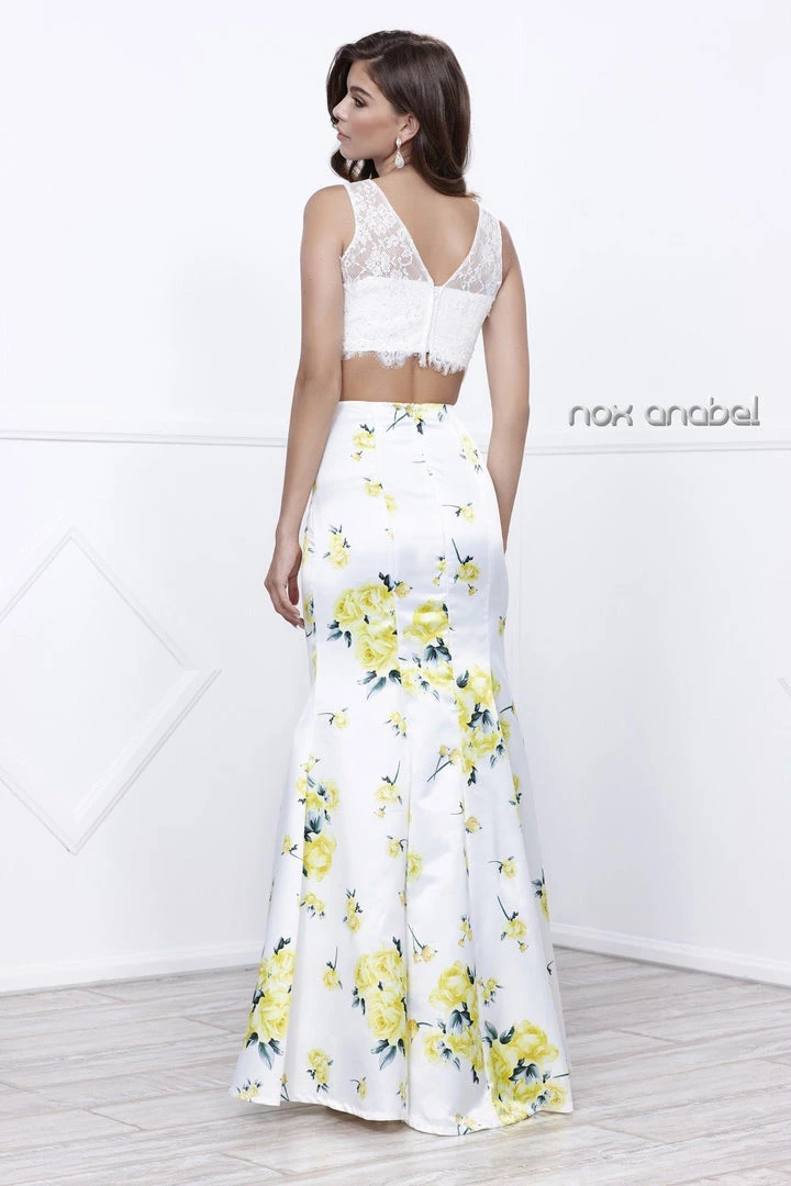 Dazzle the room in this two-piece crop top yellow floral print dress by Nox Anabel Style Number 8208 at your upcoming formal event. This long evening gown features a high-neck sleeveless lace crop-top, the long mermaid skirt is decorated with a vibrant yellow floral print, and a zipper closure.