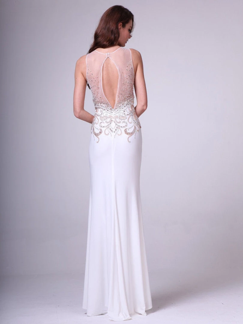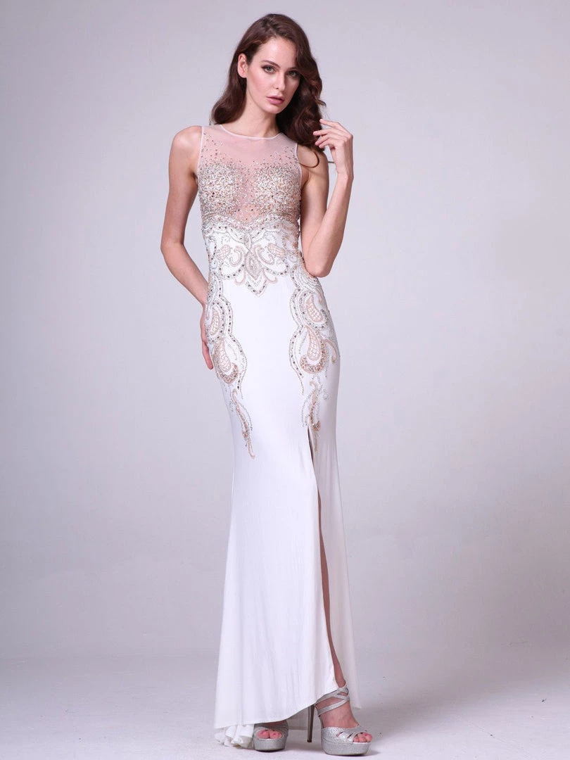 Turn heads in this bead embellished long illusion fitted white dress by Cinderella Divine 8735.