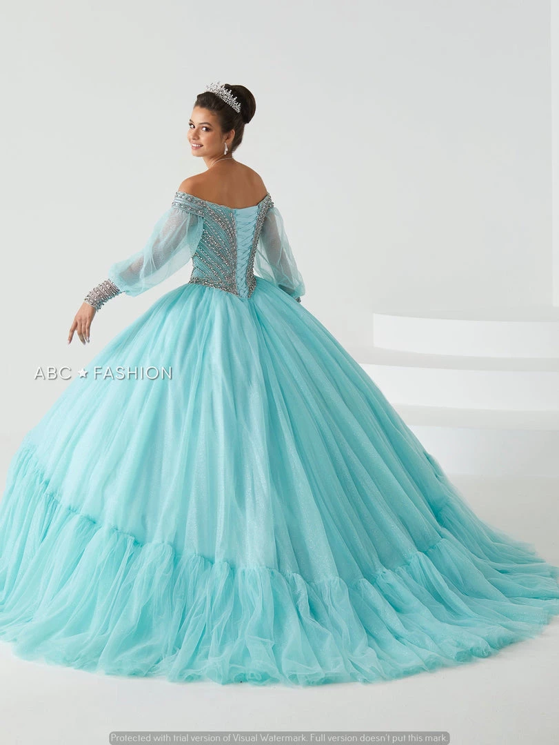 Sparkle and shine in this stunning quinceanera dress! Sweetheart off shoulder neckline with detachable sleeves and fully beaded bodice. Full gathered sparkling tulle ball gown skirt with short ruffly pleated will surely grab your audience’s attention. Lace-up back.