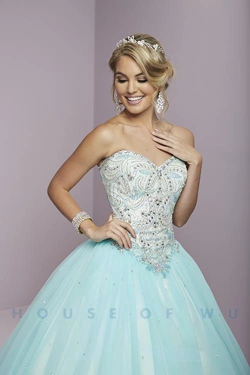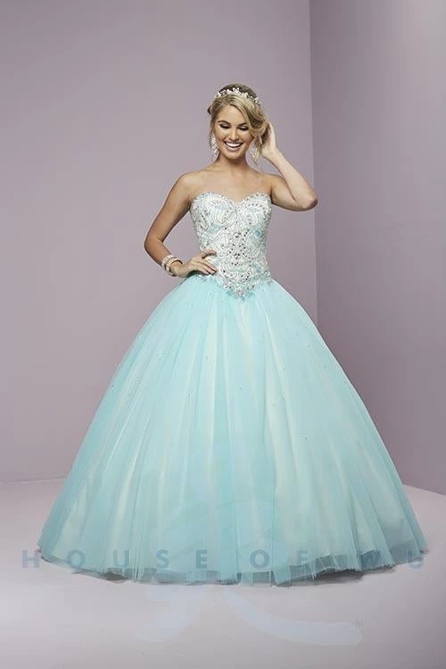 Dazzle the room in this beaded long strapless sweetheart dress with A-line skirt by House of Wu Fiesta Gowns Collection 56287. The sweetheart neckline of this ballgown is lined with sequins and small AB stones, and yet this dress still has the chunky bead work we all love, notable for the star cluster at the dip in the basque waist.