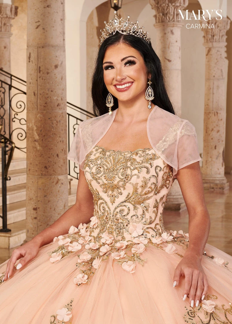 Make lasting memories in this embellished long cap sleeve dress with A-line skirt by Mary’s Bridal Quinceanera MQ1091. This glitter tulle Quinceanera ball gown features a square neckline, cap sleeves, hanging bead strands, 3D flowers, appliques, beading detail, lace-up back closure, sweep train, and a bolero jacket.