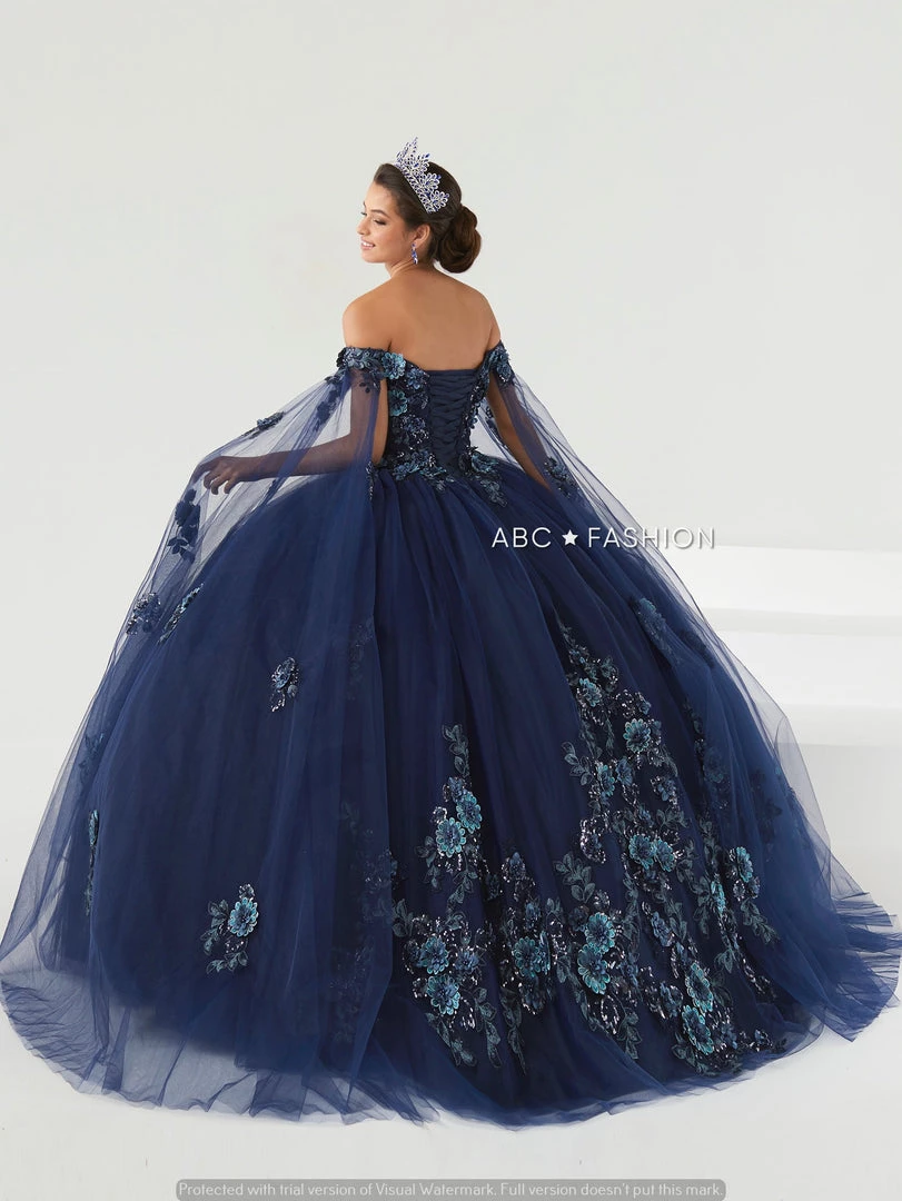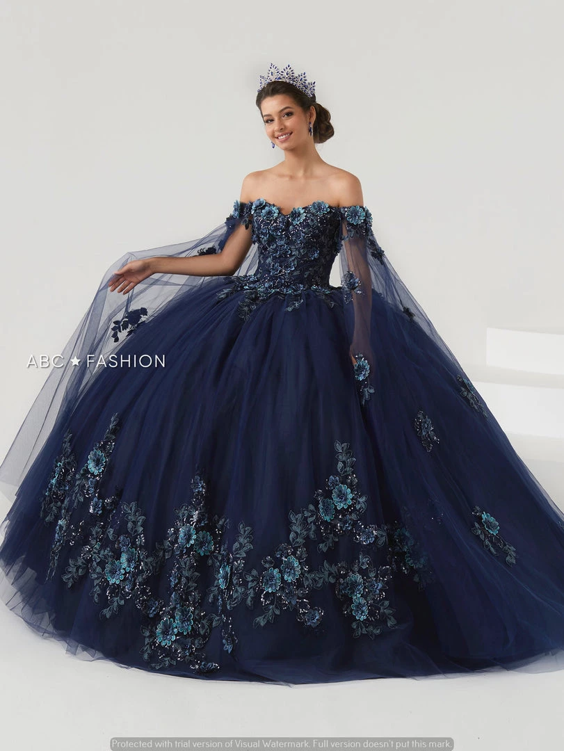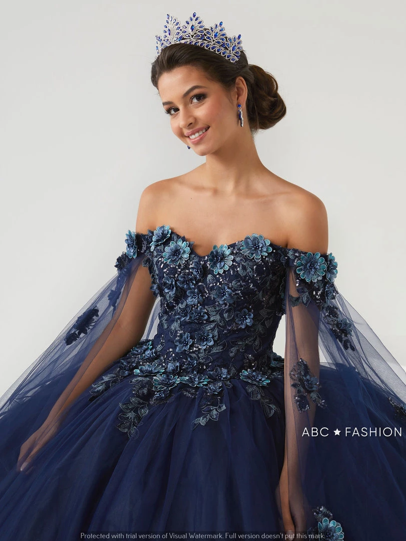 Dance the night away in this 3D floral applique off shoulder dress with detachable cape sleeves. Made out of tulle, this beautiful off shoulder cape ball gown features a sweetheart bodice adorned with 3-dimmensional floral appliques, cape sleeves, open back, and a floor length A-line skirt with lace appliques. This look is finished with a lace-up corset back and a sweep train.