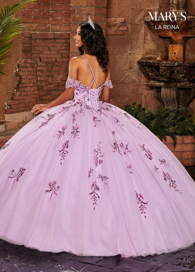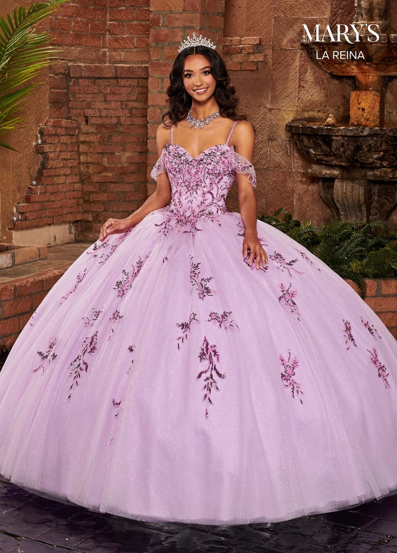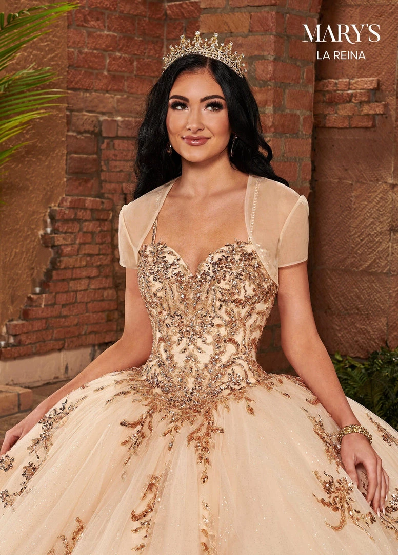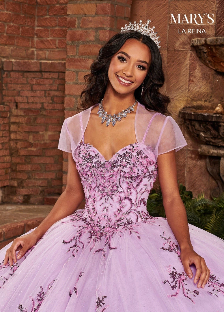 All eyes will be on you in this bead embellished long cold shoulder dress with A-line skirt by Mary’s Bridal Quinceanera MQ2130. Cold shoulder glitter tulle ball gown with a glittering beading around the sweetheart neckline and straps, iridescent floral applique cascading down the skirt. The gown finishes with a corset back and a sweep train. The matching bolero jacket is included.