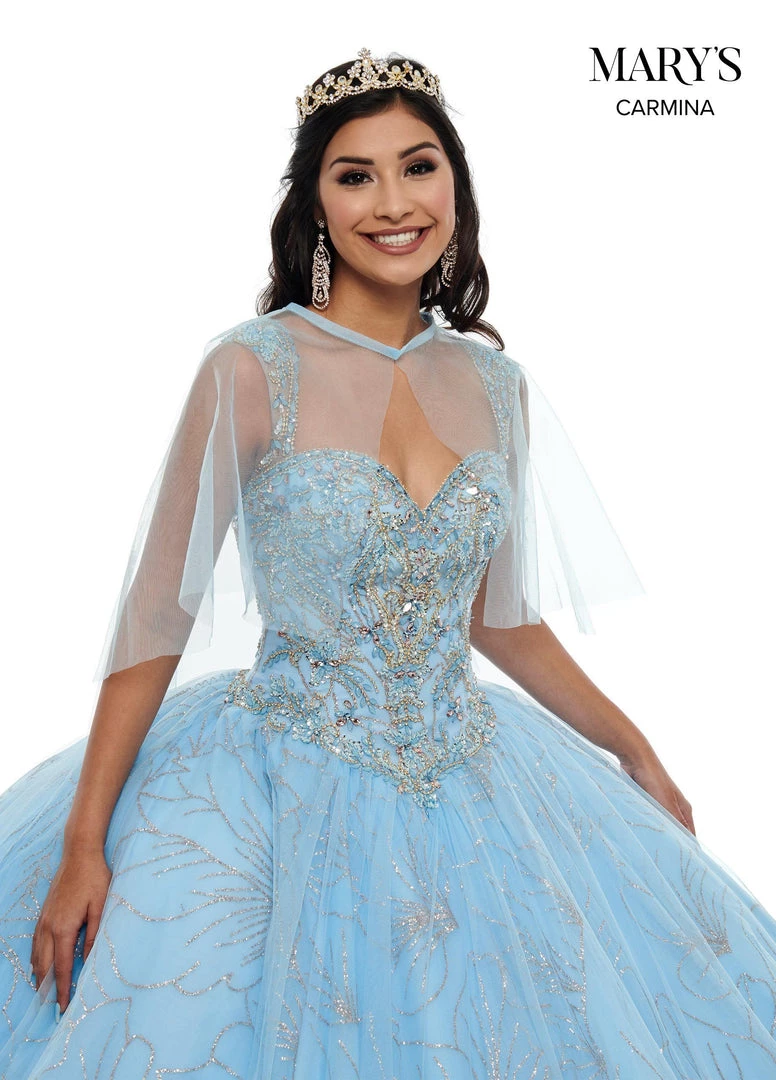 Receive lots of compliments in this long floral glitter dress with A-line skirt by Mary’s Bridal Quinceanera MQ1063. Sparkling floral glitter tulle ball gown with a sweetheart neckline and a fully beaded bodice. The bodice, cap sleeves and sheer back keyhole yoke have been crystallized and sparkle magically! The gown finishes with a lace up back closure and a sweep train. The matching cape is included.